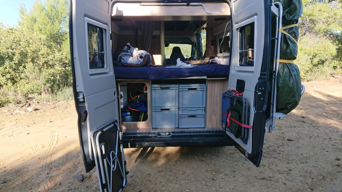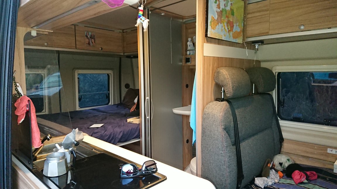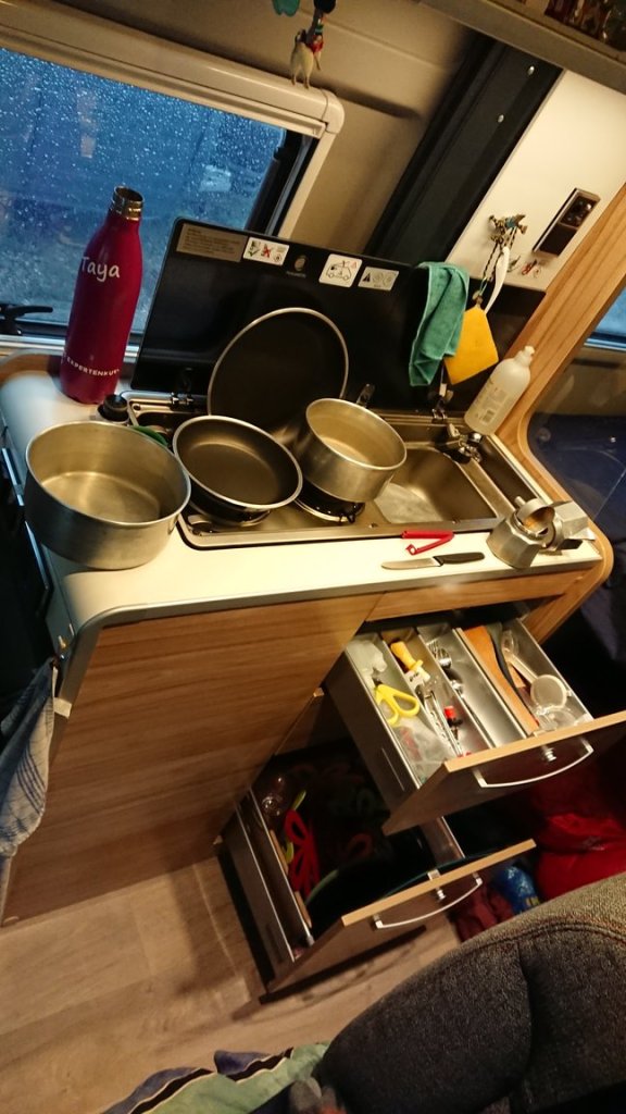 Ansonsten haben wir unsere Kleider, Bücher, Spiele, Laptops und Kleinkram in den Fächern im Auto verstaut. Die von Cécile ertüftelte Aufteilung, was wohin gehört, hat sich mittlerweile als sehr praktisch erwiesen. Genauso wie sich die meistens Arbeitsschritte und Abläufe in der Zwischenzeit gut etabliert haben.