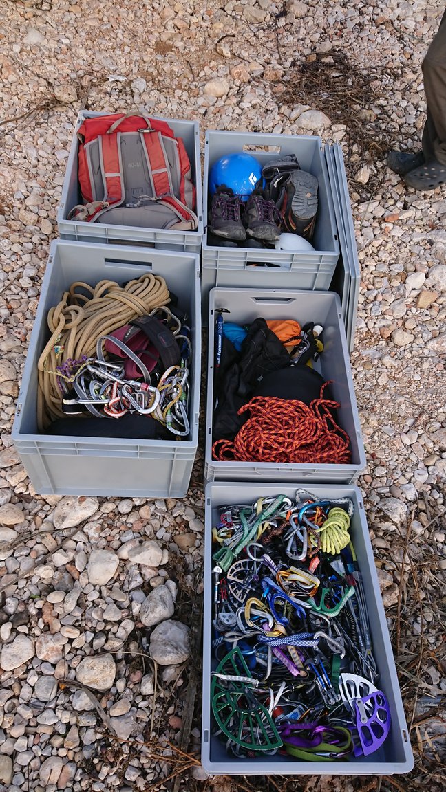 – 2x 60m Halbseile, 1x 80 m Einfachseil und 1x 50m Einfachseil, 1x 35m Reepschnur