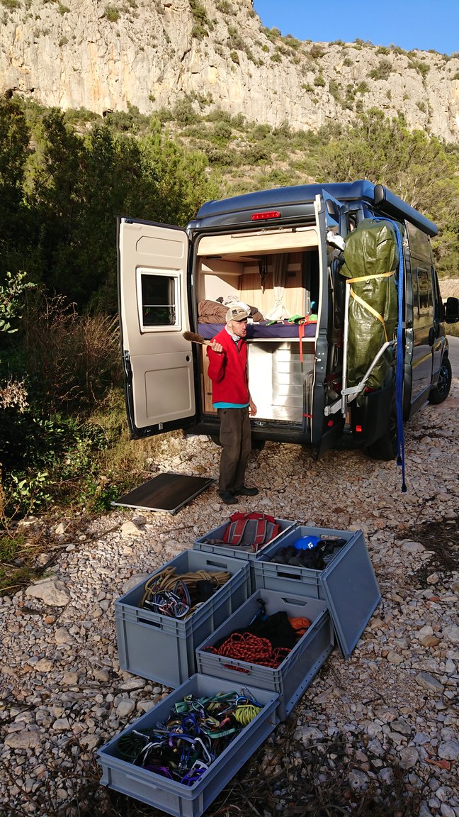 – Zelt, 3 Rucksäcke, Isomatten, Schlafsäcke (passen nicht mehr in die Rakokisten), Campingkocher da der in der Küche fix installiert ist (alles noch nicht benötigt: wir sind faul geworden 😉 )