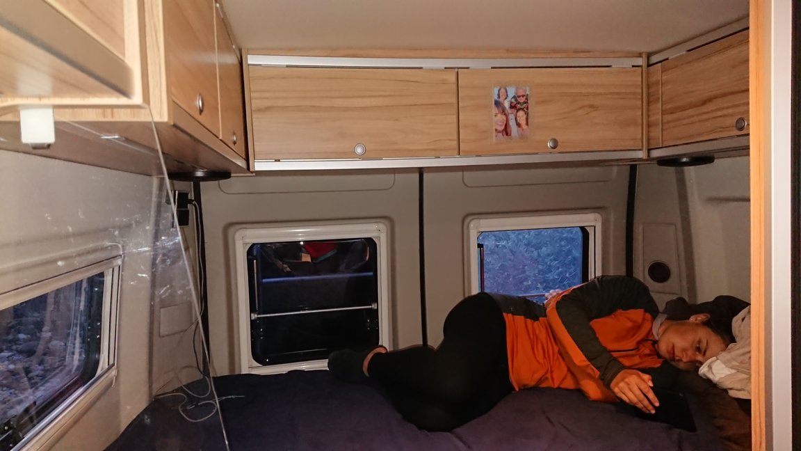 Ansonsten ist der Camper so, wie er Serienmässig ist: Küchenzeile, Wohnzimmer, Schlafzimmer und 1x1m Bad (mit WC, Waschbecken und Dusche). Zu schätzen gelernt haben wir insbesondere das Dachzelt und die Möglichkeit die Dusche entweder drinnen oder draussen in der Sonne zu nutzen. Es gibt allerdings auch einige Punkte, wo wir uns ein wenig fragen, ob es nicht wirklich das 1. oder 2. Fahrzeug dieser Serie ist: fehlende Schrauben, Schlauchabdichtungen oder ähnliches. Nichts Schlimmes, aber für mich erstaunlich bei einem Auto welches serienmässig so gebaut wird.