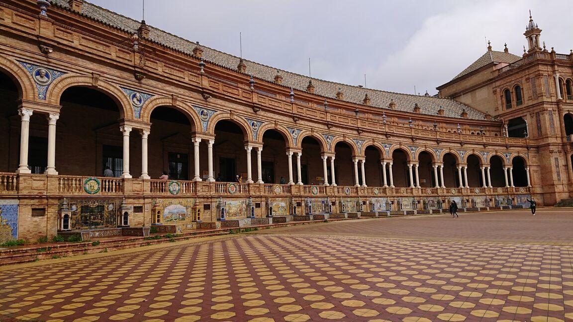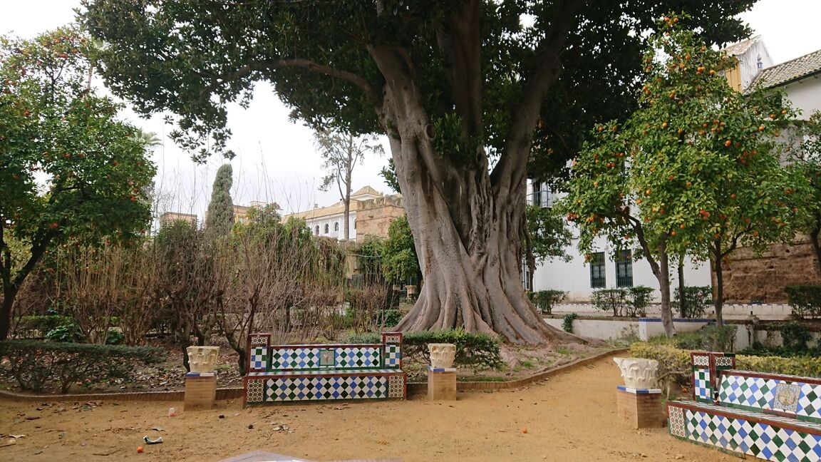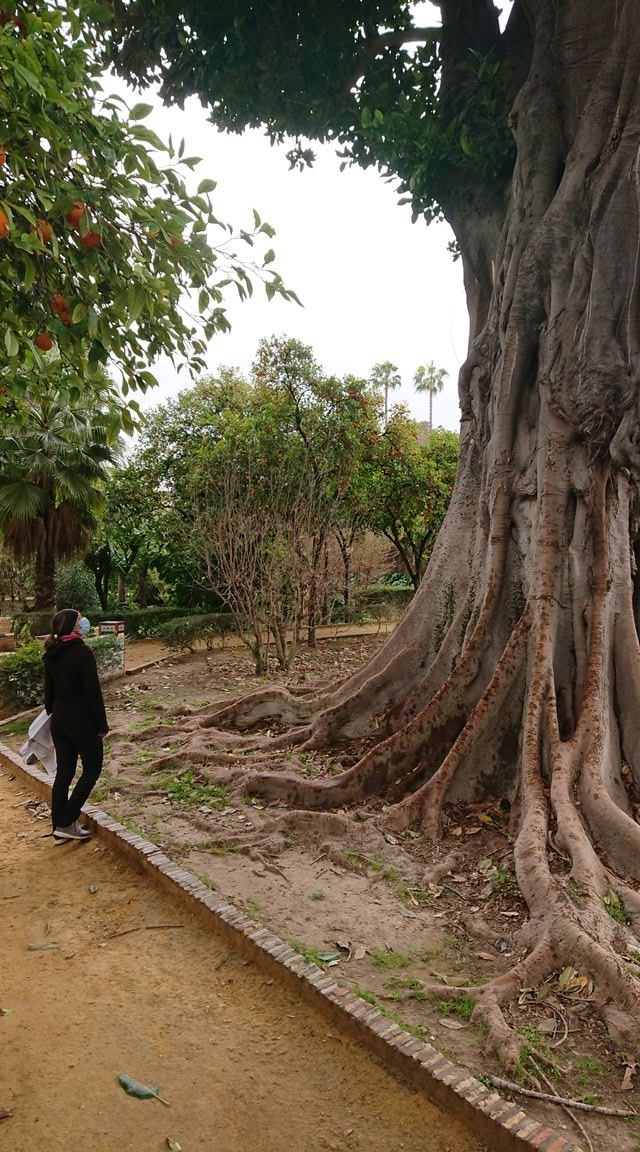 Am nächsten Tag wollen wir Sevilla, die Hauptstadt Andalusiens erkunden. Wir werden beide nicht so richtig warm mit der Stadt. Sie strahlt oft eine rechte Weitläufigkeit, fast Leere aus. Wir besuchen ein paar Sehenswürdigkeiten, wie etwa den Plaza de España, ein grosser leerer Platz mit einem Wasserspiel und hübschem Mosaiken an den Treppen und dem halbkreisförmigen Gebäude, dass den Platz abgrenzt. Vor dem Königsgarten, der von Pfauen bewacht zu werden scheint finden wir eines der Highlights dieser Stadtbesichtigung: riesige alte Bäume, die uns sehr mit ihrer Dimension beeindrucken.