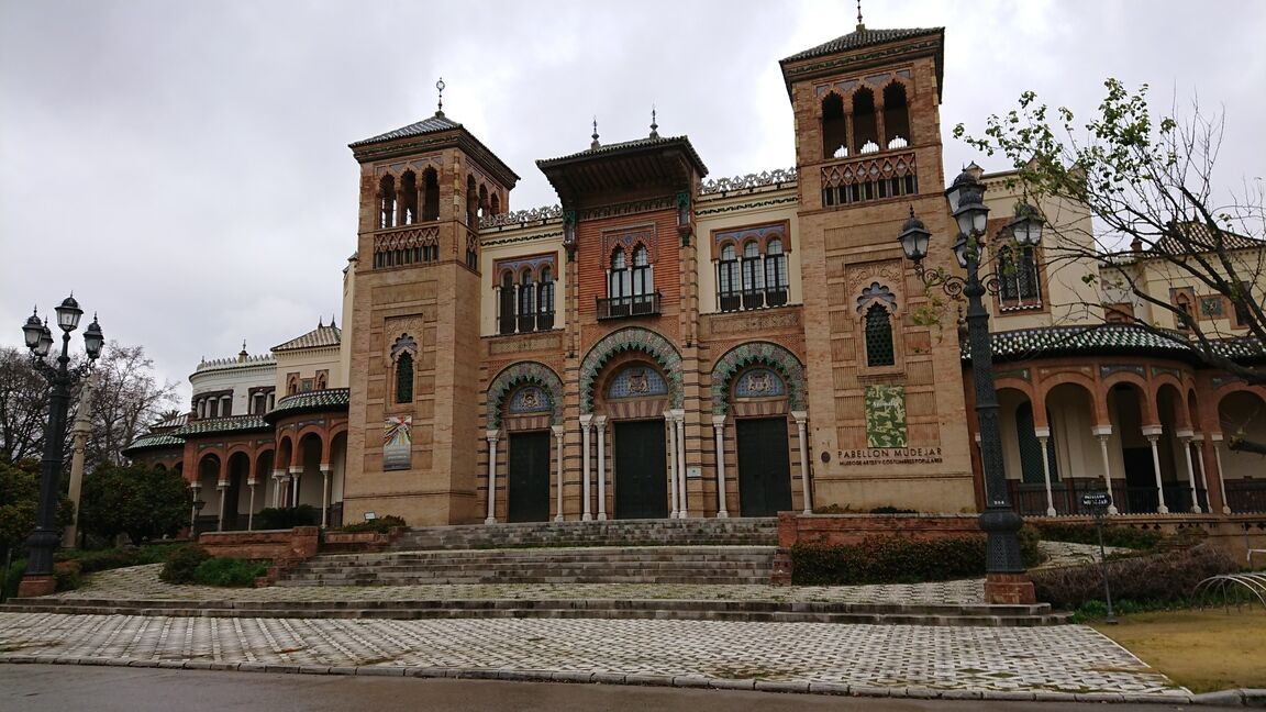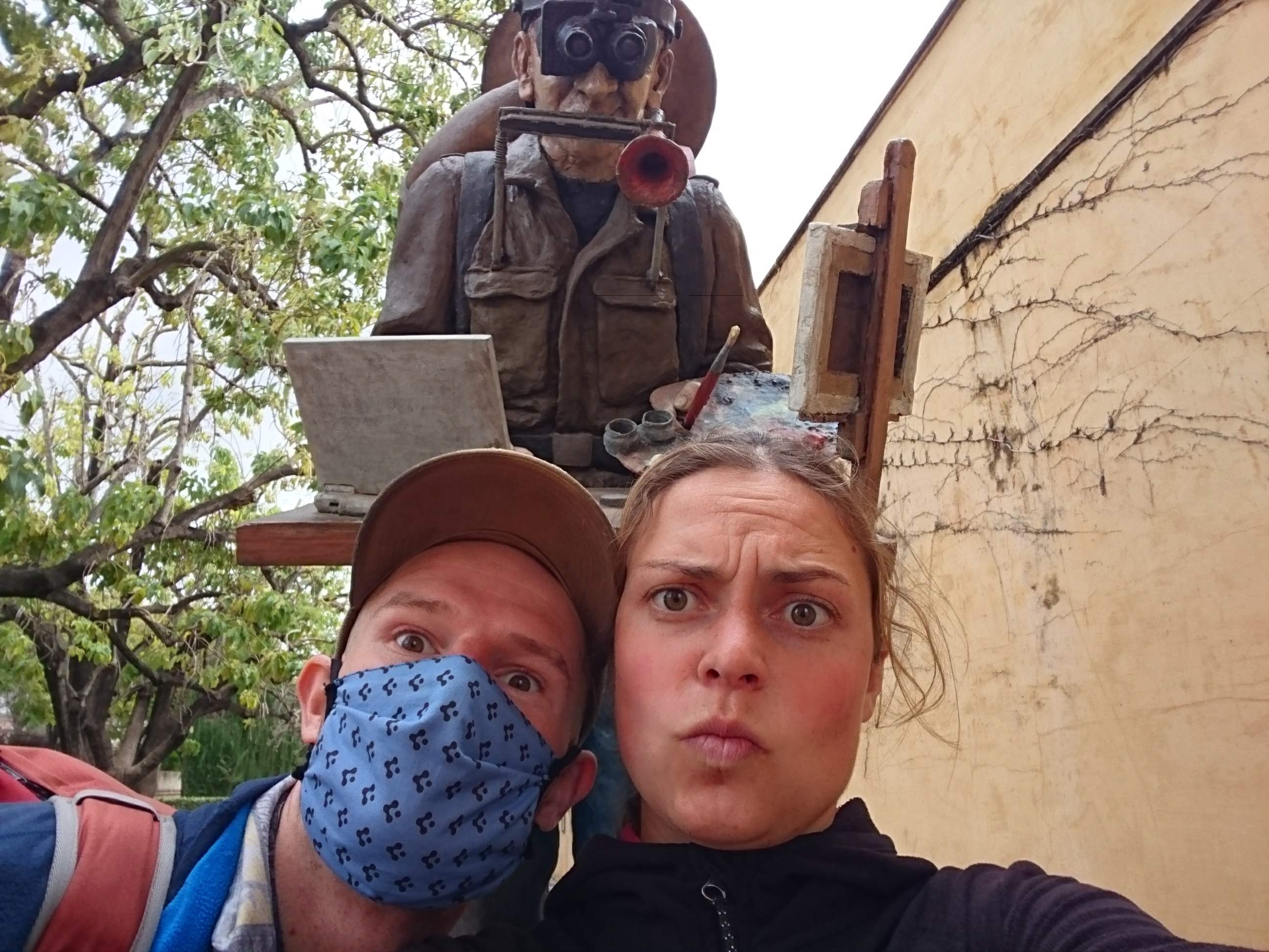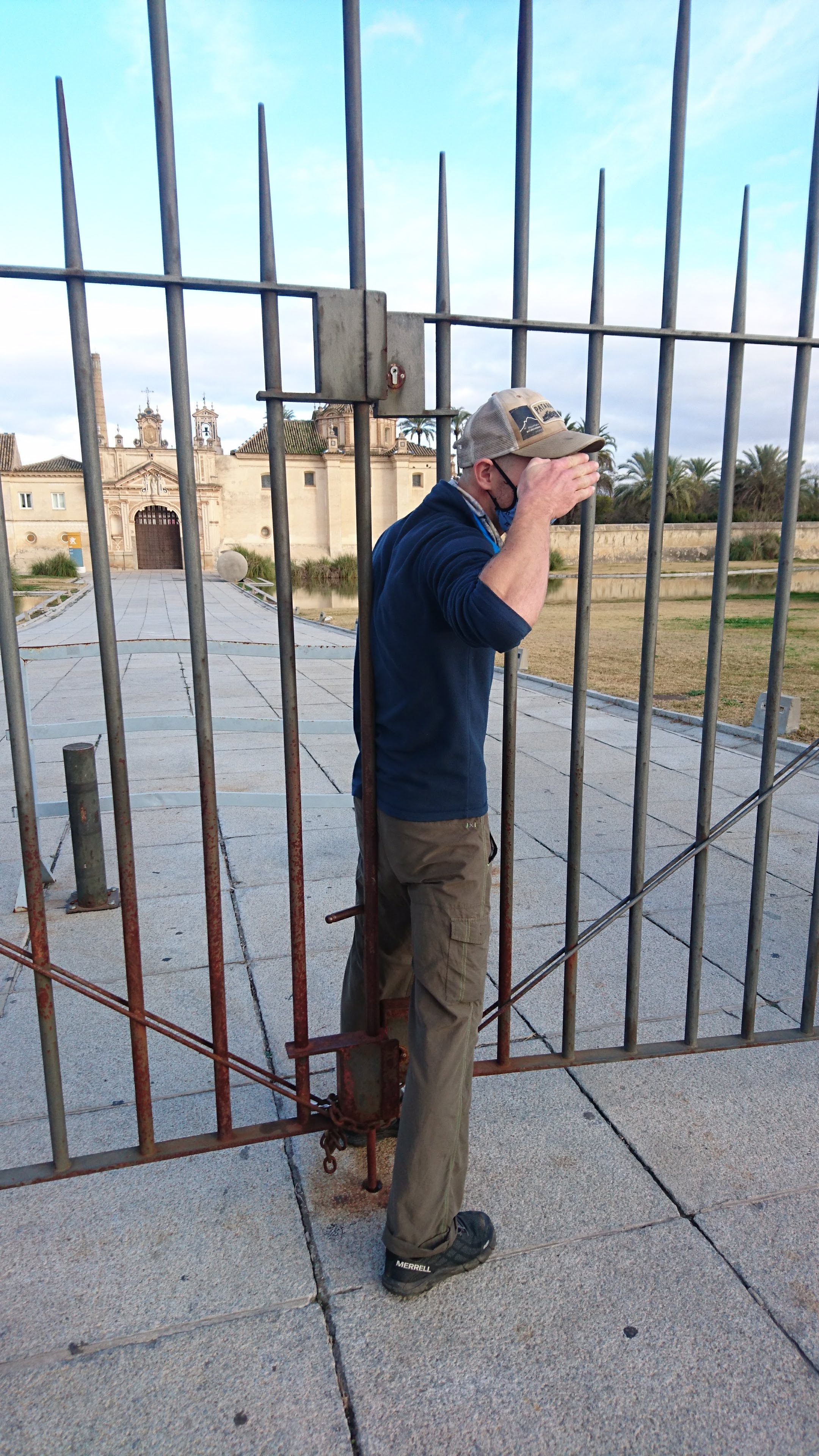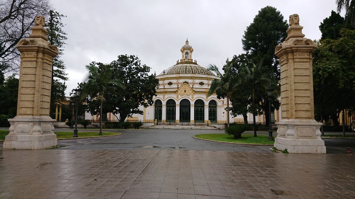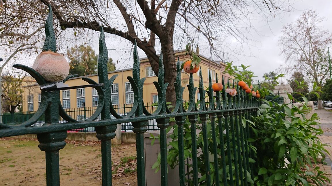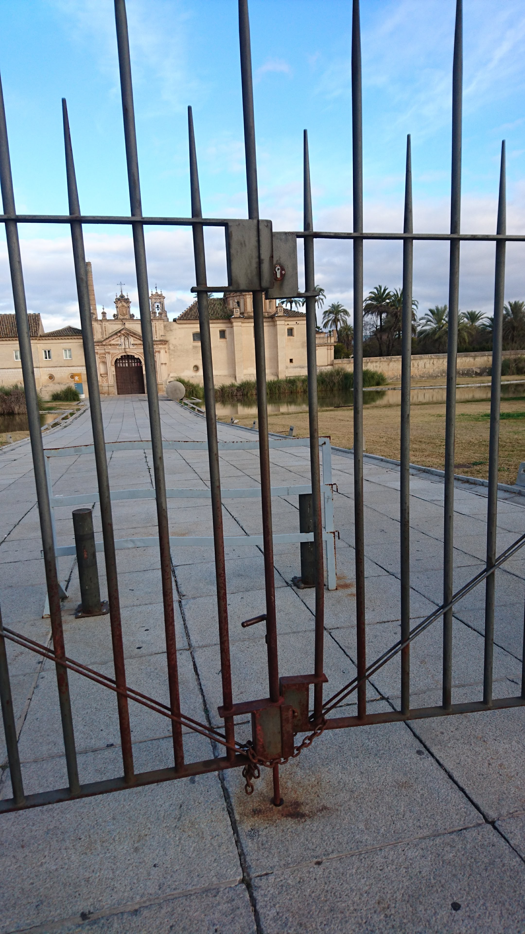 Da wir auf dem Rückweg an den Museen für zeitgenössische Kunst und Keramik vorbeikommen und das Tor zu deren Innenhof offen steht, begeben wir uns auf einen kurzen Abstecher. Die Museen sind auf dem Areal einer ehemaliger Keramikmanufaktur, welche von hohen Mauern umgeben ist. Natürlich sind beide geschlossen, wie leider sehr viele Sehenswürdigkeiten in Andalusien, doch wir finden eine witzige Statue und nutzen die Leere für eine kurze Mandarinen-Pause. Zurück am Eingang bemerken wir, dass das Tor, anders als zuvor, geschlossen ist. Und wir schaffen es nicht, dieses zu öffnen. Wir suchen ein wenig, finden aber keinen Weg über die hohen Mauern und Niemanden im Areal. Kurz witzeln wir über mögliche Schlagzeilen „Touristen eingesperrt“, doch je länger wir vergeblich eine offene Tür suchen desto ernster wird die Situation. Kurz bevor wir Hilfe rufen wollen, finden wir auf der Rückseite ein Tor, das sich öffnen lässt. Wir sind frei! Zumindest fast. Dahinter befindet sich ein weiterer abgesperrter Park, wo wir zum Glück durch dessen Zaun hindurch schlüpfen können. So hatten wir doch noch etwas Abenteuer in Sevilla.