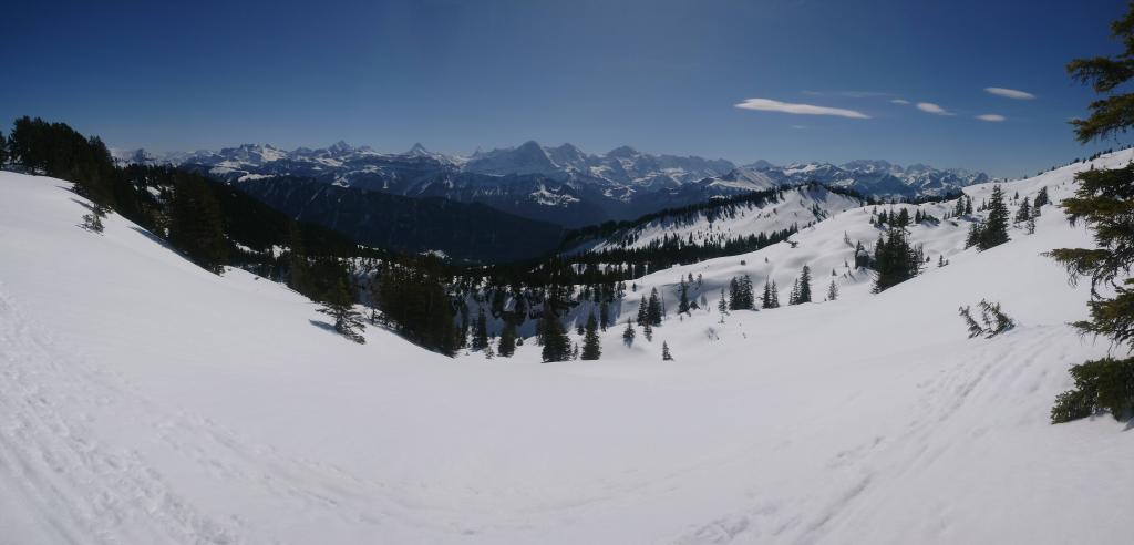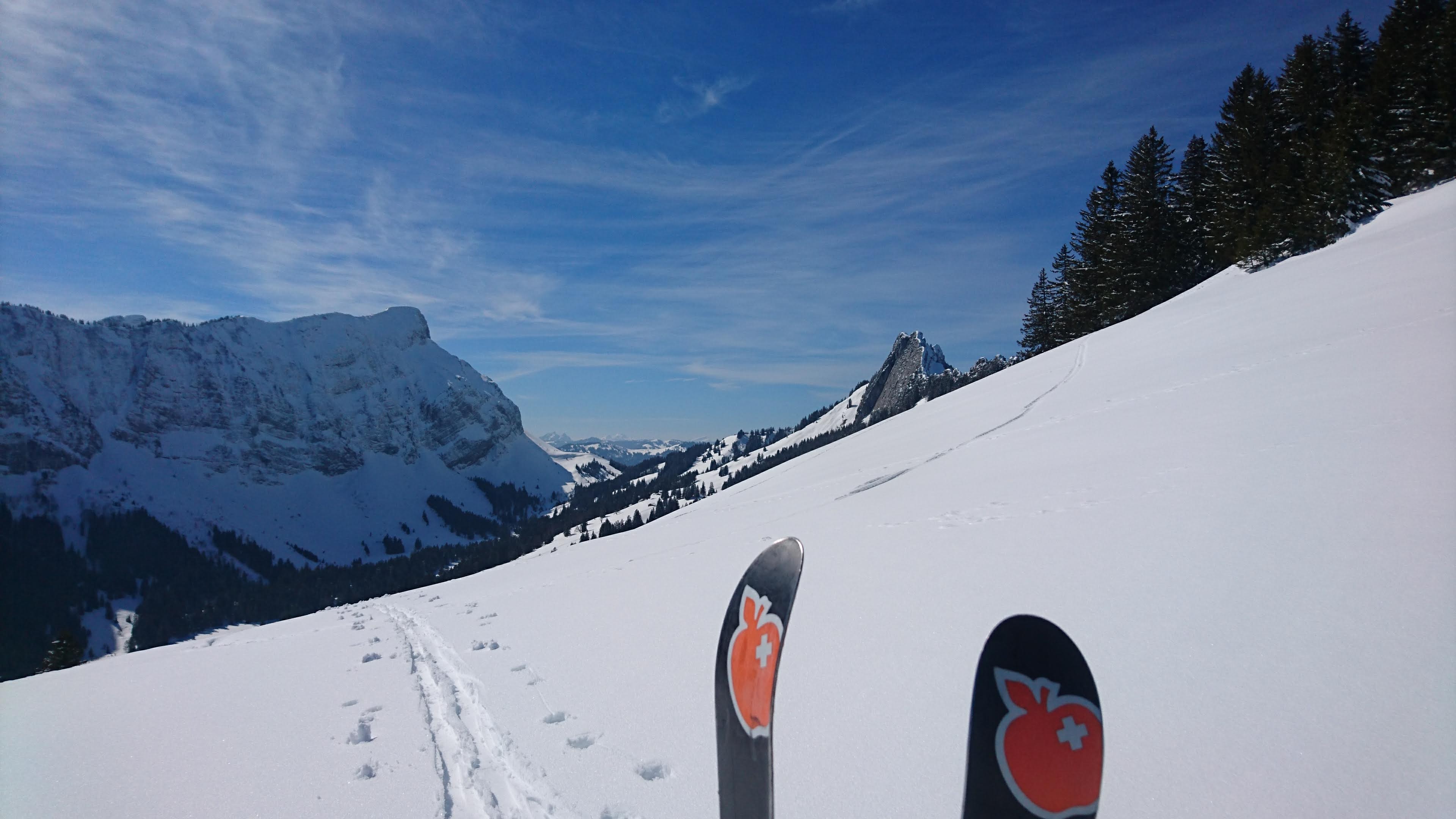 Ein schöner Tag beginnt mit dem Werweisen, ob wir die geplante Tour nun machen, oder doch besser klettern gehen. Für unsere Verhältnisse sind wir früh aufgestanden und nun stehen wir in Habkern vor einem Grashang mit einzelnen Schneeschollen. Basho beschliesst dass er es versuchen möchte und so starten wir etwas genervt von der Diskussion unsere Tour. Das Wetter verzeiht vieles und so bessert sich die Laune zunehmends. Ich bin noch zu wenig gut im Skifahren abseits der Piste um es immer geniessen zu können. In den meisten Fällen empfinde ich es als sehr anstrengend und Stress. Beim Mittagessen mit dem Blick über die ganze Bergkette vom Berner Oberland, mit Sonne im Gesicht und nichts als Natur um uns, denke ich jedoch daran, das Skitouren irgendwann zu mögen.