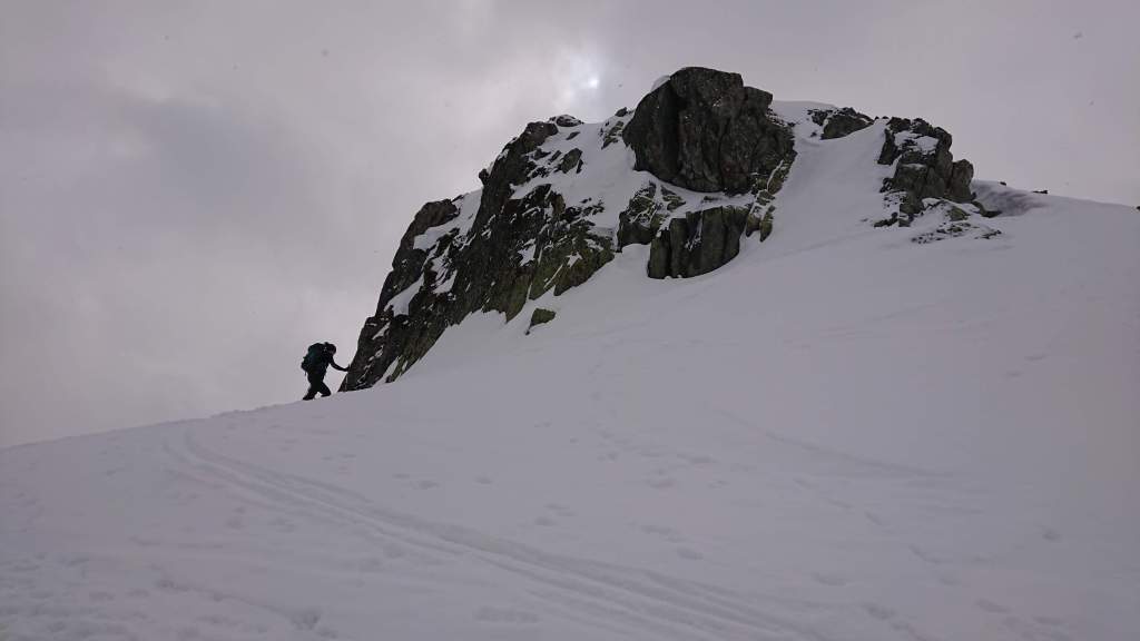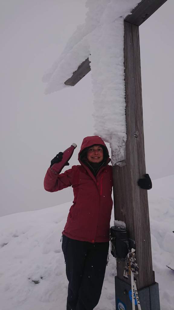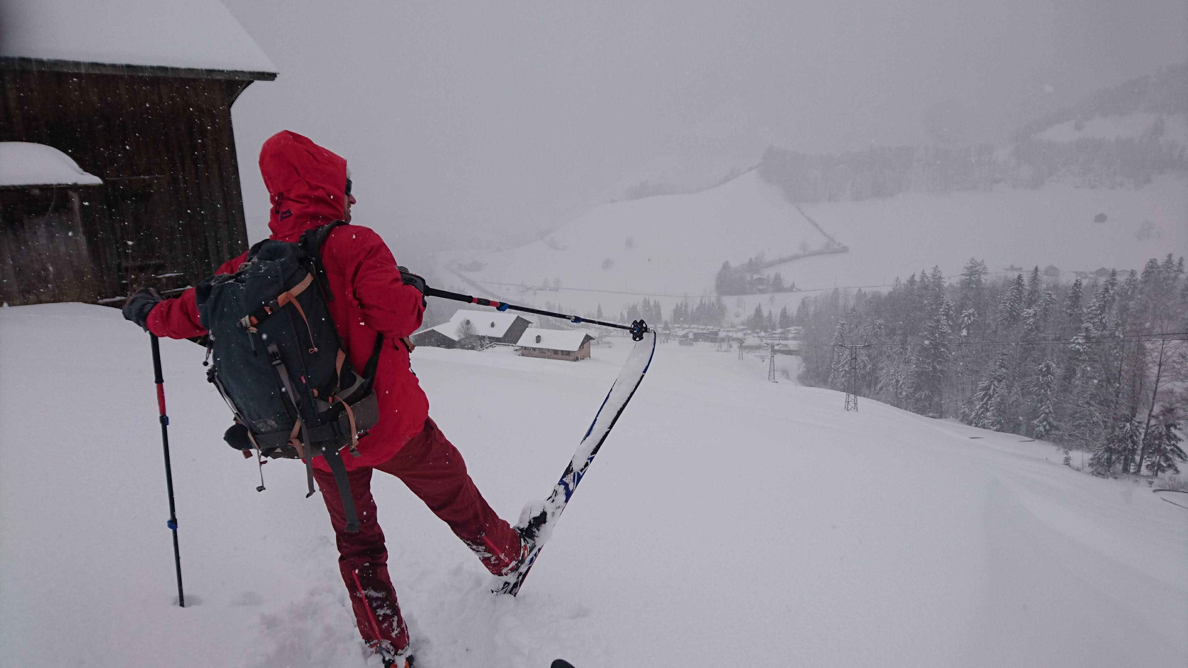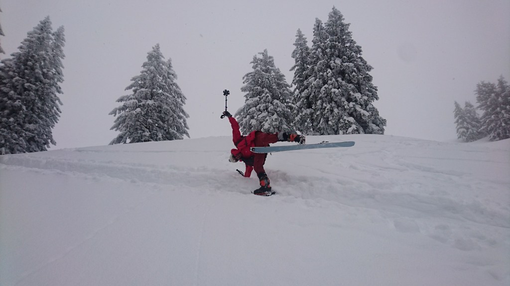 Die zweite Tour startet gleich am nächsten Tag. Das Wetter hält sich wie am Vortag. Nach wenigen Metern auf der Strasse löst sich die obere Schnalle meines Skischuhs und fällt zu Boden. Macht nichts, einmal zurück, Schraube festdrehen und nochmals von vorn. Von gestern spüre ich noch eine Druckstelle am Knöchel die sich bestimmt nicht verbessern wird, aber ich beisse auf die Zähne und sage nichts. Diesmal geht es besser, Basho lässt mich öfters vorne gehen und ich finde in meinen Rhythmus. Als er mir dann von weitem den Gipfel zeigt, bin ich erfreut – es geht nicht mehr lange und die Sonne kommt, so dass wir wohl bei Sonnenschein Pause machen können! Es vergehen noch einige Spitzkehren und dann endlich sind wird da! Also das dachte ich… Falsch! Das ich mitnichten der Gipfel, dieser befindet sich weiter zurückgesetzt nochmals ca. 150 Hm weiter oben. Langsam habe ich Hunger, der Himmel zieht zu und es beginnt zu winden. Mit dieser Erkenntnis und dem Wetterwechsel fällt meine Laune und Motivation rapide. Im Nachhinein wäre es besser gewesen dort umzudrehen. Ab dort wurde die Tour zu einer Tortour, ich hätte eine längere Pause gebraucht, aber das fiese Wetter hielt uns davon ab. Dick eingepackt schlich ich aufwärts, den Sinn in dieser Aktion nicht mehr sehend. Kurz vor dem Gipfel hatte ich genug – alles was ich jetzt noch hochging, musste ich ja schlussendlich auch wieder runterfahren. Ich zog die Felle ab und liess Basho noch alleine hochmarschieren. In der Abfahrt spürte ich dann so richtig meine Oberschenkel: von der Tour gestern gut gebraucht. Dieses Skifahren ist kein Genuss, nur sch* anstrengend!