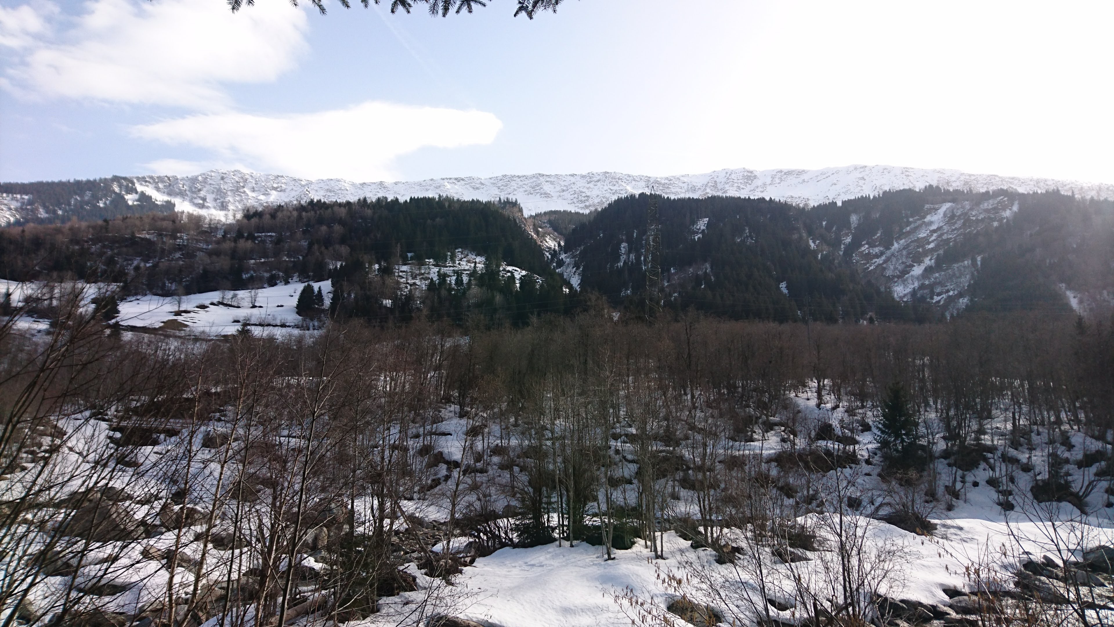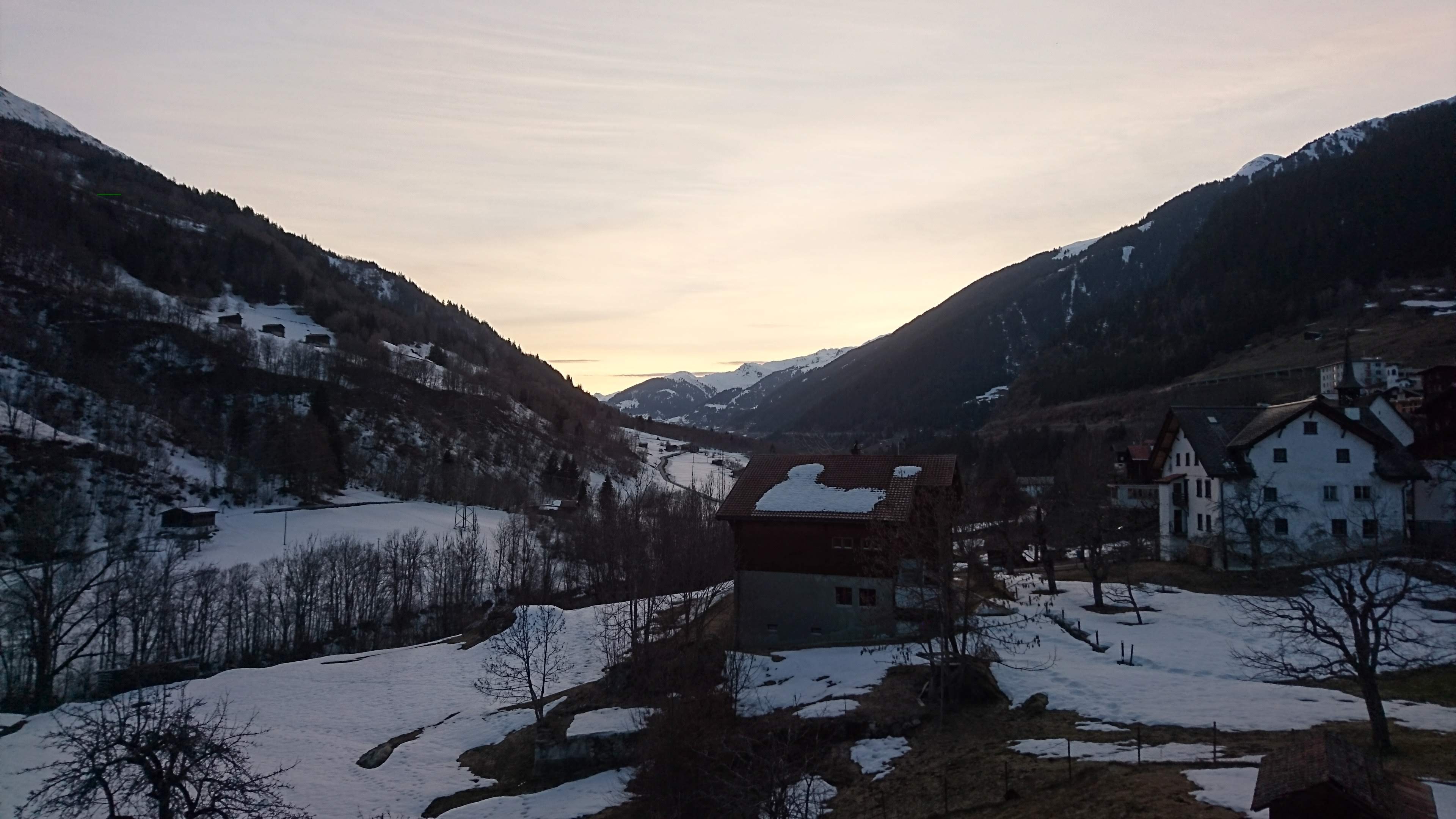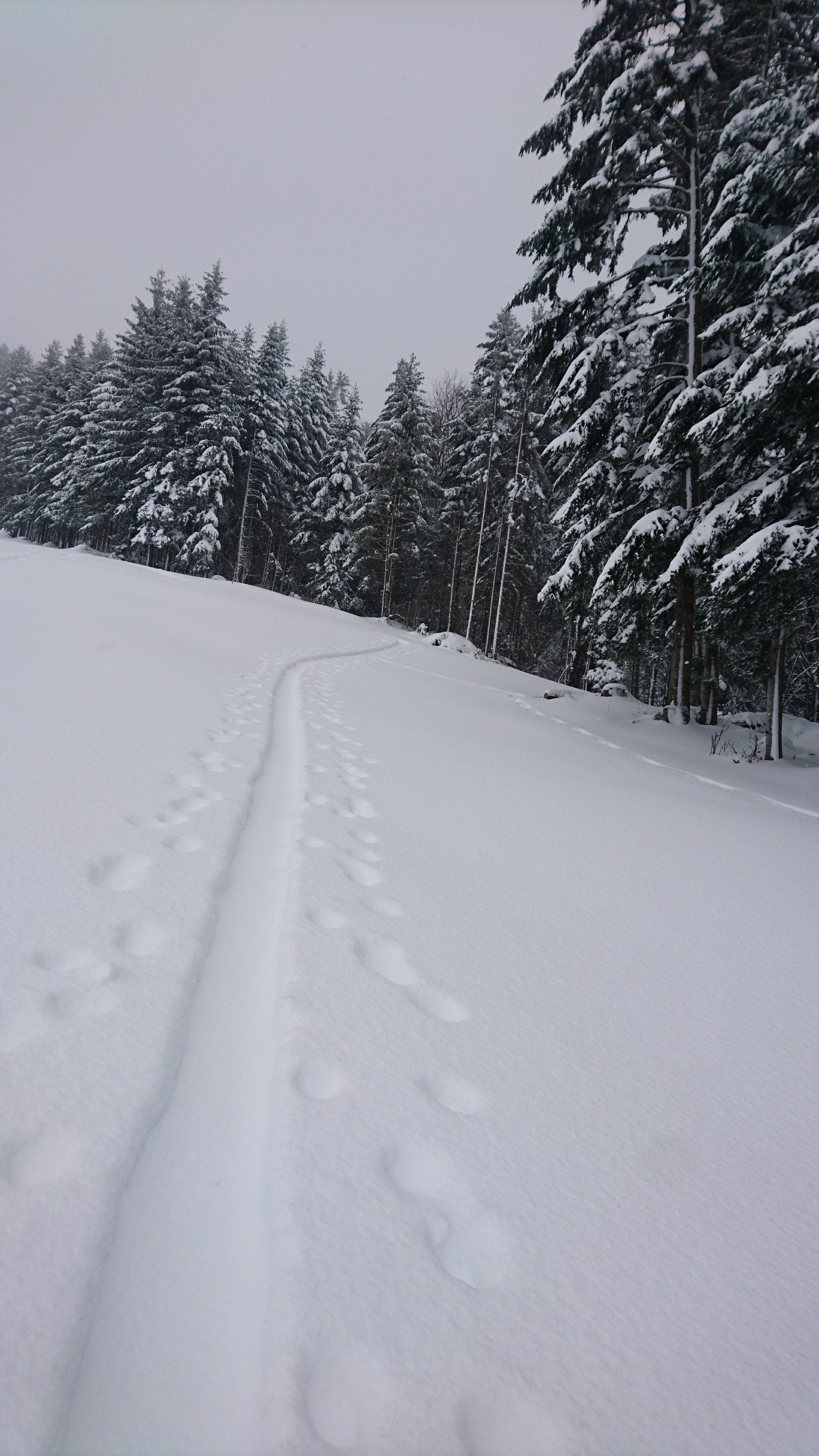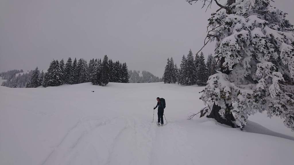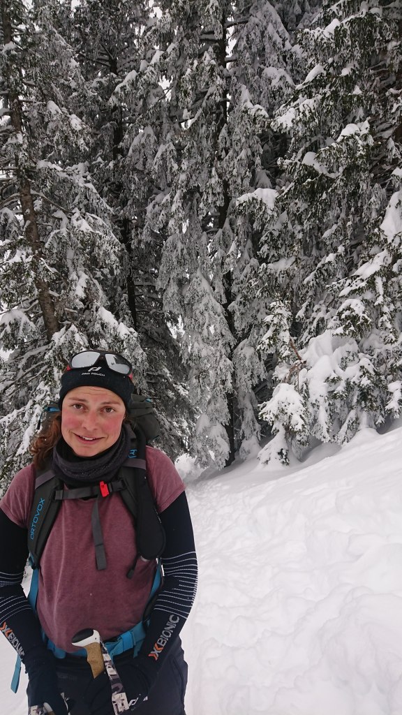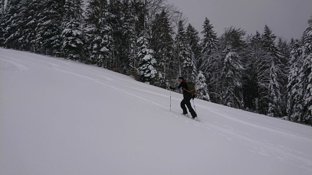Sarah’s Eltern erlaubten uns, nachdem Sarah und Roger wieder heimfuhren, noch ein paar Tage in ihrer Ferienwohnung zu bleiben. Und so starten wir meine erste Skitour diese Saison, mit neuen Skis (Occasion von einer Kollegin übernommen, Merci Anaïs!) gleich vor dem Ferienhaus. Bei bewölktem Himmel gehen wir los. Wenige Meter auf der Strasse um dann bald schon auf die Ski zu wechseln. Basho zieht voller Freude voran und ich gehe tapfer mit. Nach ein paar Hundert Höhenmetern wird der Abstand zwischen uns immer grösser, ich ärgere mich über meine Kondition und verliere mich in einem dermassen Stress, dass sich meine Atmung auch nicht mehr beruhigen kann. Verärgert stampfe ich von einer Atem-hol-Steh-Pause in einem viel zu hohen Tempo los, um nach ein paar Metern wieder stehen zu bleiben. Basho gelingt es auch nicht, mich aus meiner Situation zu holen und so entschliessen wir uns ca. 300 Hm unter dem Gipfel umzukehren. Fazit: 1. keine zu grossen Erwartungen setzen auf der ersten Tour 2. Eigenes Tempo gehen und halten.