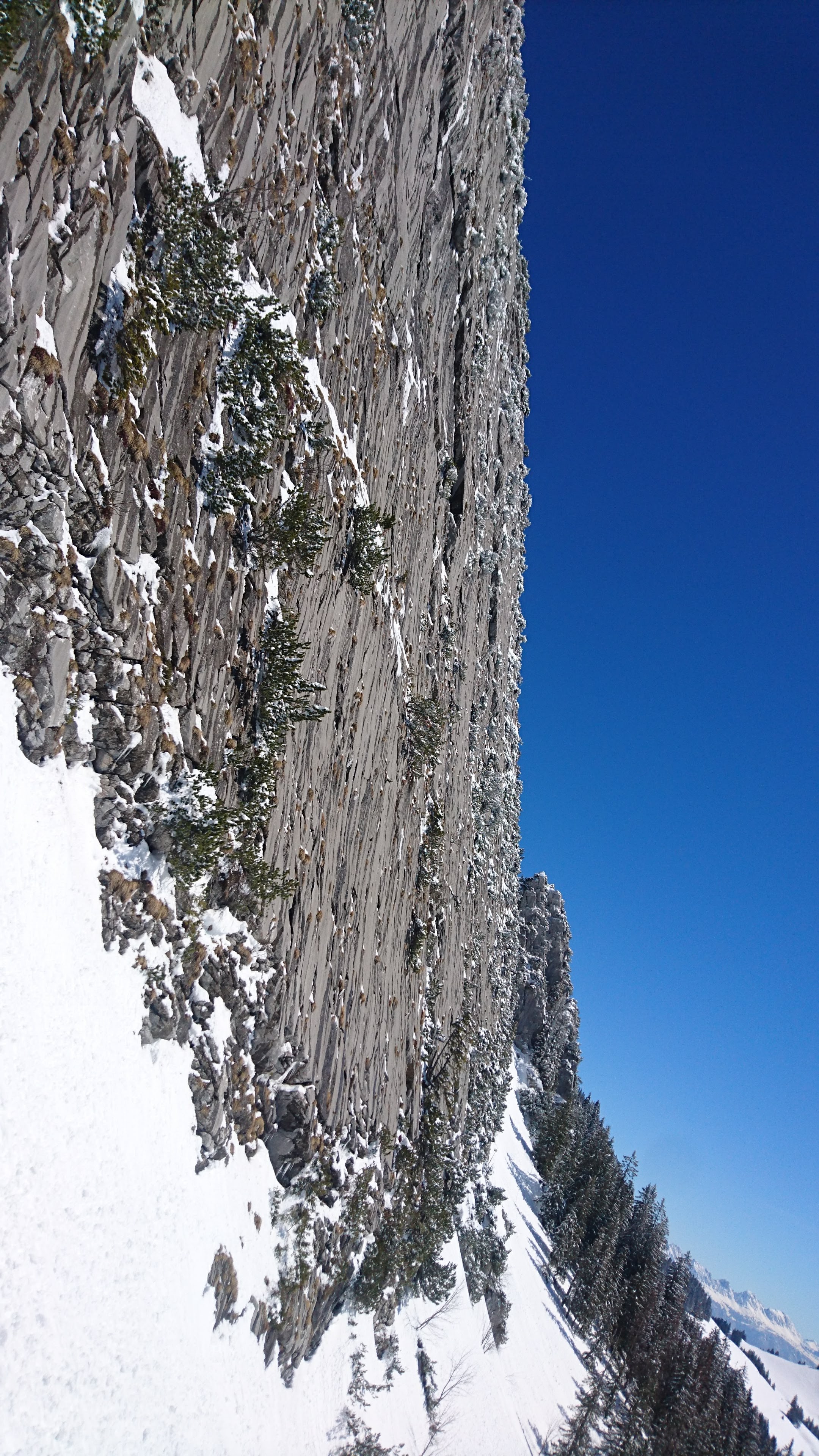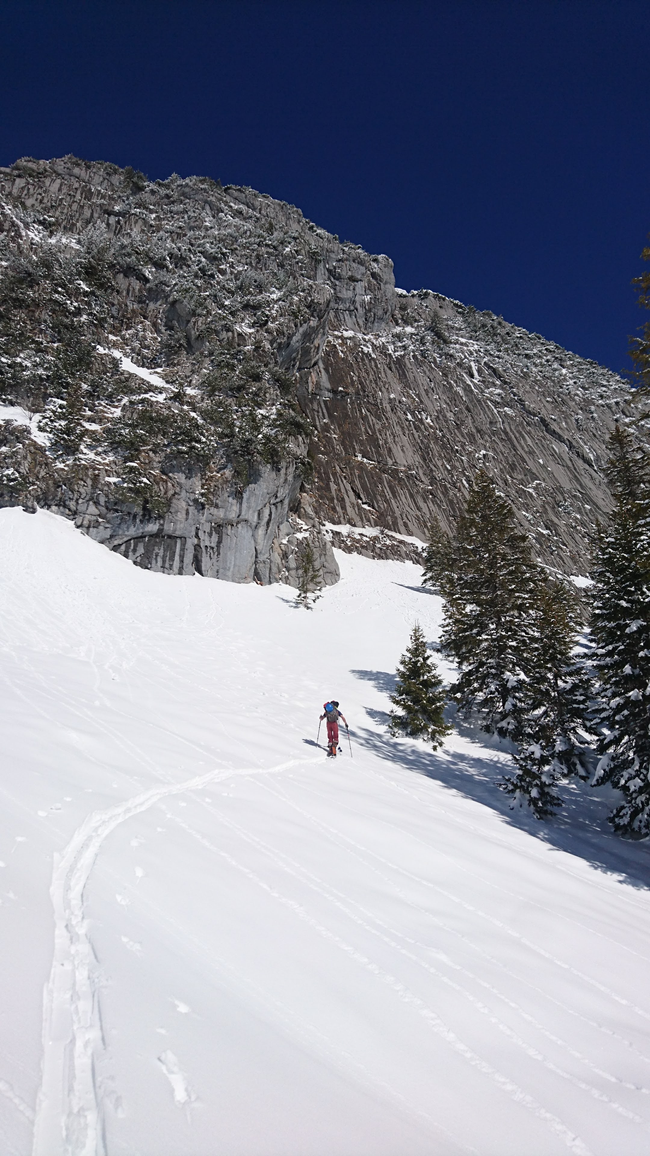 Am Fels sind wir nicht mehr ganz so zuversichtlich. Die Wand ist relativ «flach» und die Grasbüschel und kleinen Büsche werfen durch die relativ hohen Temperaturen immer wieder Schnee und Eisbrocken ab. Wir entscheiden uns gegen den Eisregen und diskutieren die Alternativen. Weit von anderen Klettergebieten entfernt und mitten im Wildschutzgebiet (Skitouren sind nur auf einzelnen eingezeichneten Wegen erlaubt) wird das Kletter-Ski-Abenteuer zu einer Ski-Wanderung mit viel Gepäck… Wenigstens das Wetter stimmt.