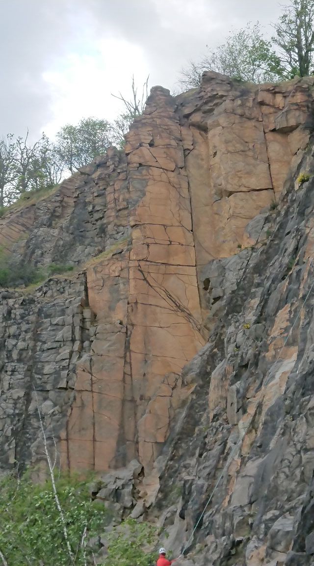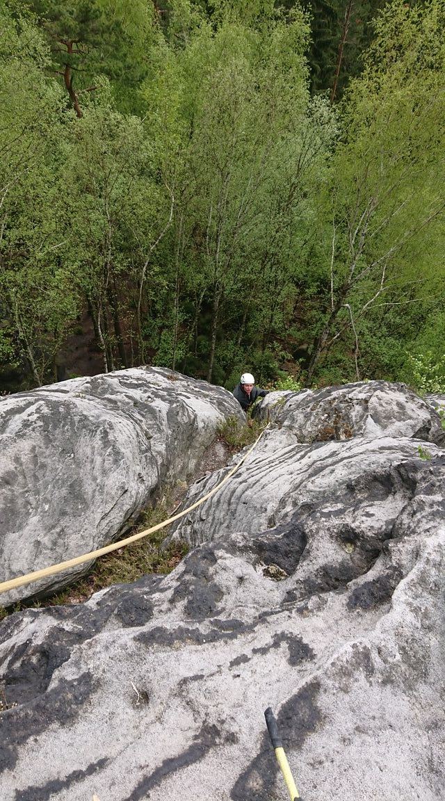 Am ersten Nachmittag erkunden wir die Gegend nur per Pedes und treffen statt eigenbrötlerischer sächsischer Kletterer freundliche, aufgeschlossene Sachsen die auch für Tipps aufgeschlossen sind oder gerne Tipps geben. Natürlich können wir nicht viel mehr Hinweise geben als, ja 4 Meter vor dir, hinter der Ecke ist mal wieder ein Ring. Natürlich ohne wirkliche Ahnung. Selber tun wir uns auch ein wenig schwer: Ringe oder Haken die den Weg weisen sind rar und wir haben keine echte Topo.
