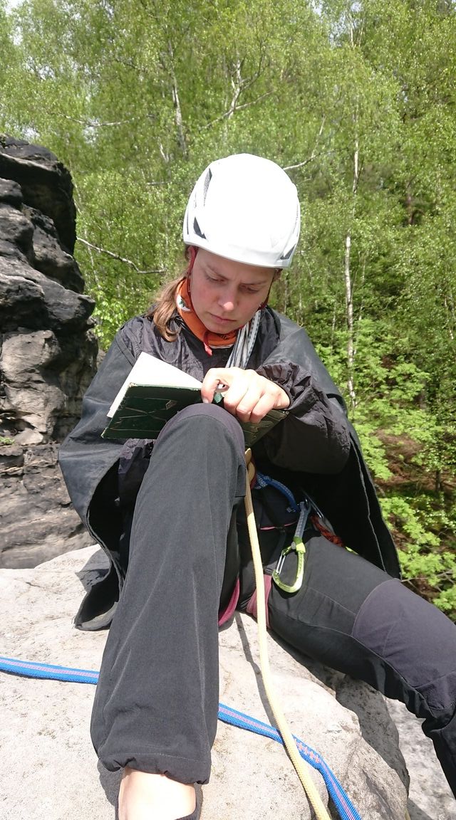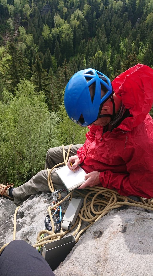 Am nächsten Morgen bereiten wir uns ausgiebig vor: wir basteln einen Satz mobiler Sicherungsgeräte, da ausser Stoff, Schlingen, Schnur und Seil nix weiter erlaubt ist und die Ringe zum Sichern sehr sehr spärlich sind. So ausgerüstet erkunden wir ein paar Türme und klettern ein paar lässige Routen. Bis uns das wechselhafte Wetter mal wieder eine Abwechslung in Form von einem Wolkenbruch gönnt. So entscheiden wir die Turmgruppe zu wechseln und ziehen weiter. Wir merken wie zeitaufwändig das Ganze ist, aber es macht Spass. Wir entscheiden oft sehr defensiv, da wir kaum Erfahrung im Sandstein mit traditionellem Klettern haben. Am Ende können wir uns doch in die Gipfelbücher von ein paar hübschen Türmchen eintragen. Mir bleiben fantastische Routen und Möglichkeiten, viel Gripp und noch mehr Lust auf mehr sächsischen Sandstein.