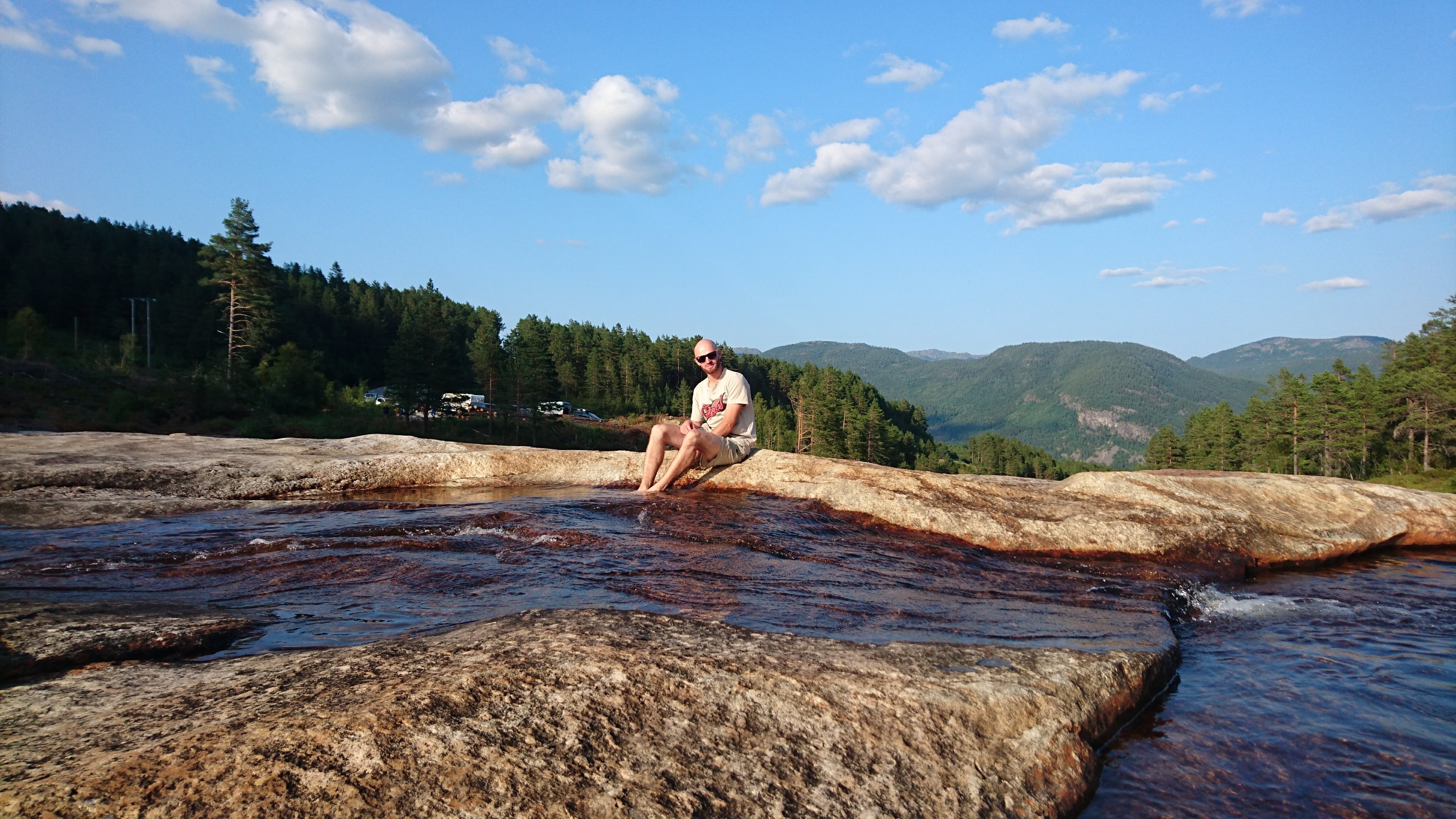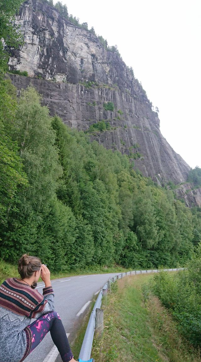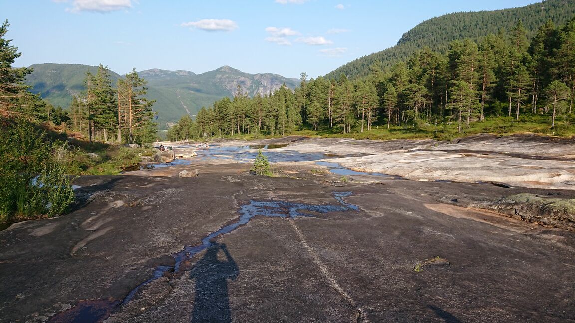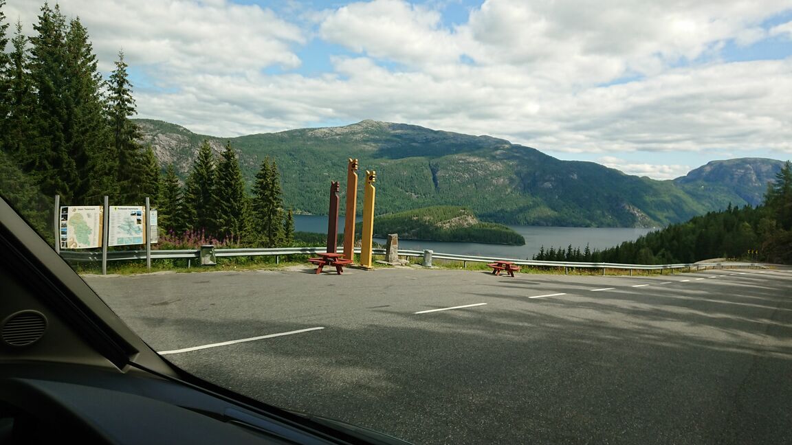 Nach so viel Sport waren wir bereit für eine weitere Autofahrt – ins Nachbartal, Richtung Westen, ins Setesdal. Dort soll es wieder grosse Wände und tolle Klettergebiete geben. Die Fahrt hat uns den ganzen Tag beschäftigt: es geht vorbei an kühlen Bergseen, Schafen mitten auf der Strasse und teils sogar über unbefestigte Strassen (Kieswege). Dabei überqueren wir ein Hochplateau. Ich bin wieder sehr erstaunt, Norwegen hat eine sehr niedrige Bevölkerungsdichte, aber Ferienhütten und Hüttensiedlungen finden sich immer wieder und lassen das Land sehr zersiedelt wirken. Ich finde es nicht gut, denn leider sind diese Siedlungen oft hässlich und an ökologisch sehr zweifelhaften Orten.