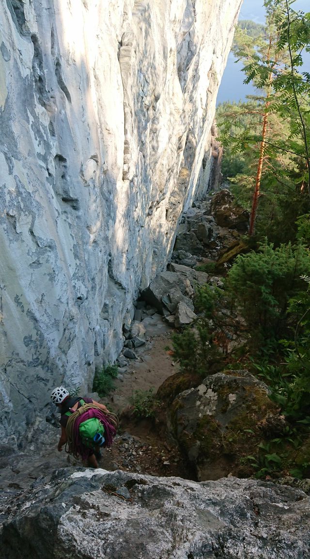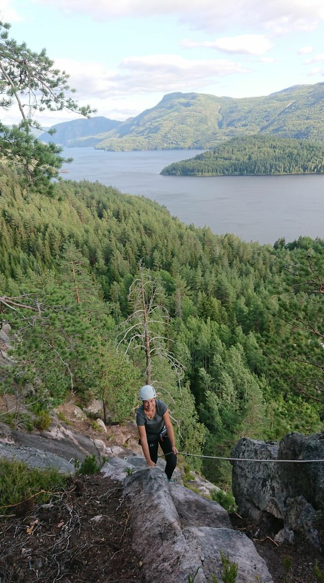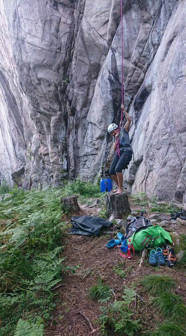So waren wir bereit für eine small Wall zum Klettern. Im Klettergebiet Sundenuten haben wir erst mal das Gebiet erkundet, eine kurze Mehrsseillänge gemacht und: einen Klettersteig (Wandern an ein paar Drahtbügeln und Fixseilen). Langweilig war der Klettersteig nicht, weil noch nicht fertig und man wusste nie ob schon alle Steigbügel fest verankert waren. Unsere Erkenntnis des Tages und wohl auch des ganzen Gebietes und Kletterns bisher: Norwegen hat viele tolle Berge, Felsen und kaum Routen und Kletterer. Wir hatten auf Anhieb ein paar tolle Linien entdeckt, allerdings gab es dort noch keine Routen. So haben wir am nächsten Tag mit den existierenden Routen vorlieb genommen. Ein paar schöne Längen waren dabei und ich konnte mal wieder richtig in einer schweren Route scheitern: ich hatte und werde auch in Zukunft, glaube ich, keine Chance (haben) 😀 .