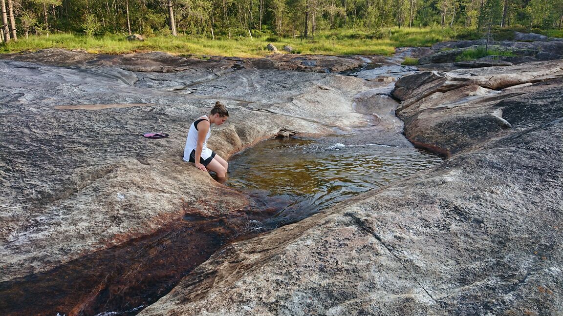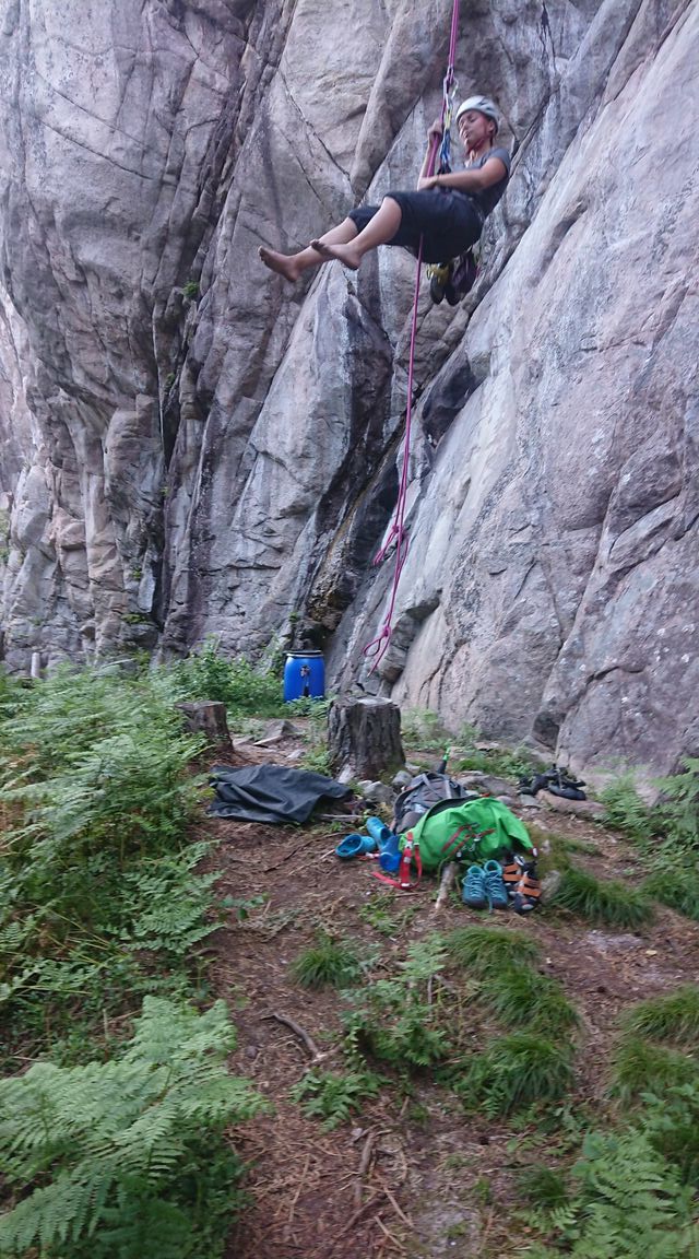Nach der Arbeit kommt das Vergnügen und wir besuchen den hochgelobten Klettergarten Urdviki. Der Zustieg geht durch Blaubeeren, Haus-grosse Blöcke (mal links, mal rechts, mal querdrüber, mal halb unten durch) zum Wandfuss der beachtlich steilen Wand. Diese ist allerdings für Granit unerwartet stark strukturiert: es sieht stellenweise so aus als ob Würmer den Fels angefressen hätten und an anderen Stellen könnte Mensch meinen es wäre erstarrter Teig. Die Routen sind kreativ und doch recht schön. Allerdings ist es einer der heissesten Tage, so dass wir nicht zu lange bleiben und am nächsten Tag für den kühlen Vormittag wiederkommen (Merci Cécile fürs sichern 😀 ). Meine Meinung, auch wenn ich nicht die schönste 8a Norwegens versucht hab: wirklich ein toller Klettergarten, vorausgesetzt man klettert souverän 6c und besser.