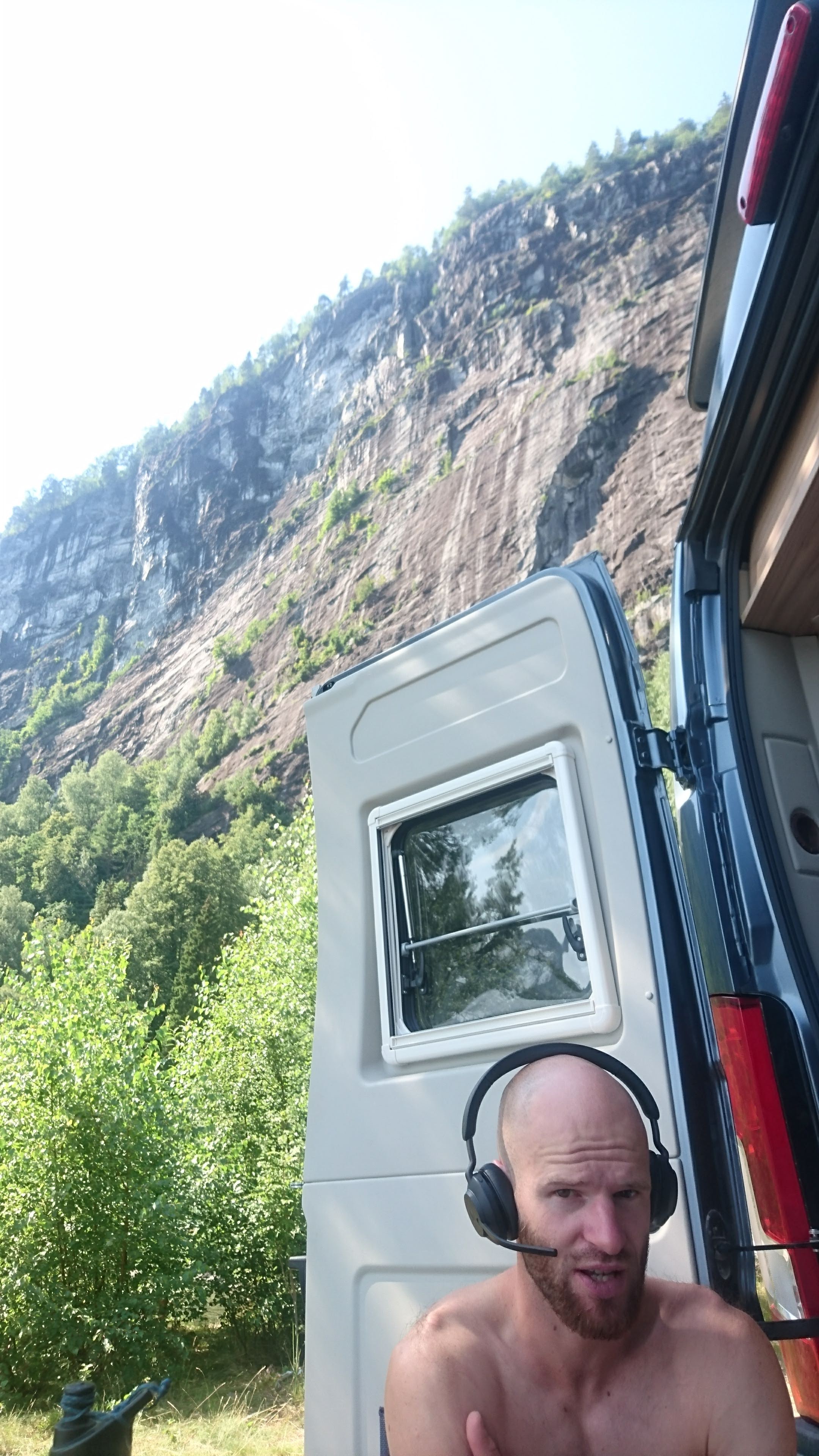 Im Setesdal besuchen wir auf der Durchfahrt noch den grössten Ort des Tales: Valle. Die Gemeinde hat 1 Einwohner pro km2 und ganze 1164 Einwohner, das Dorf selbst wohl eher 100 – 200. Es ist ein sehr touristischer Ort, aber wirklich hübsch. Nach einer Runde durchs Dorf spazieren, rollen wir weiter talabwärts. Wir lassen die grossen Kletter-Wände des Tals hinter uns und stellen uns in die Nähe eines Sportklettergebiets, dass ich gerne sehen will: Urdviki. Doch vorher muss ich zwei Tage arbeiten. Direkt am See, bei sommerlichen Temperaturen vergehen die zwei Tage wie im Flug. Wir bewundern noch die Felswand direkt neben uns: sie sieht toll aus, noch niemand hat sie beklettert und wir kommen beide ins Sinieren was mit einer Bohrmaschine alles möglich wäre dort einzurichten. Nur fehlt es eben nicht nur an dieser, sondern auch an Kletterern.
