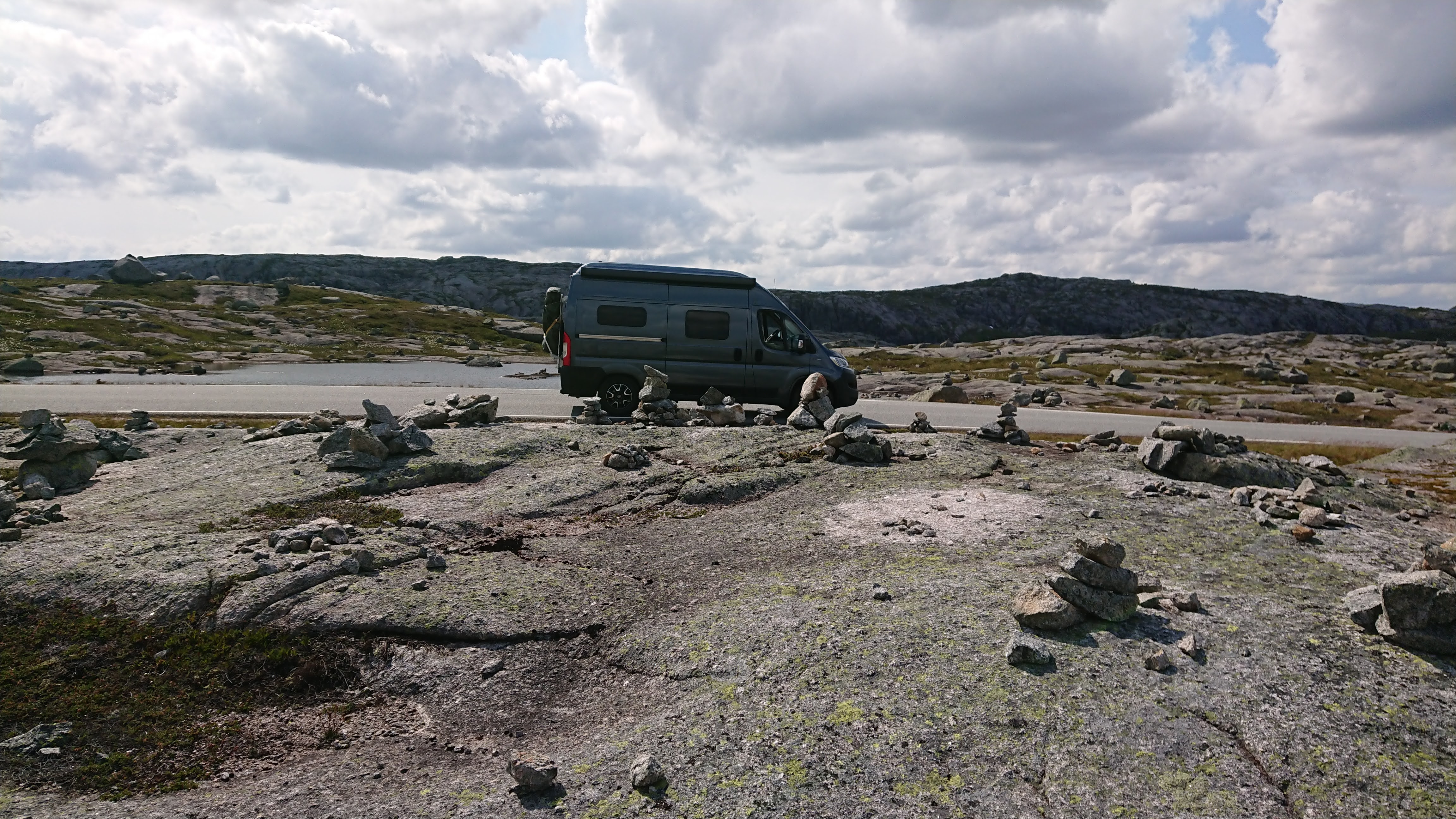Für den offiziellen Wanderparkplatz nehmen die Norweger 300 Kronen (30 Euro) pro Tag. Wir sparen uns die Kosten und stehen 3km weiter oben auf einem Kiesplatz – die zusätzlichen Wanderkilometer nehmen wir gerne in Kauf.