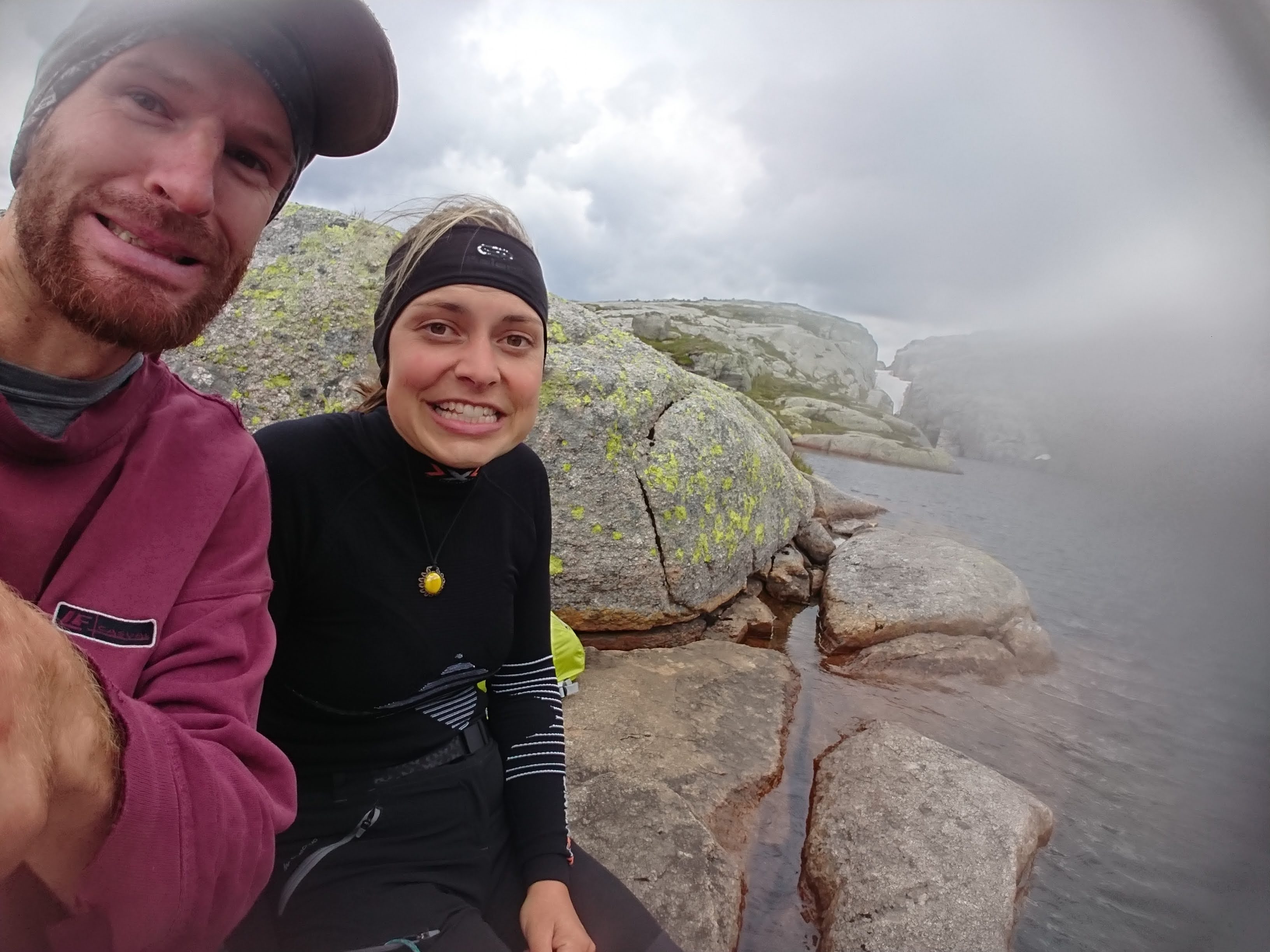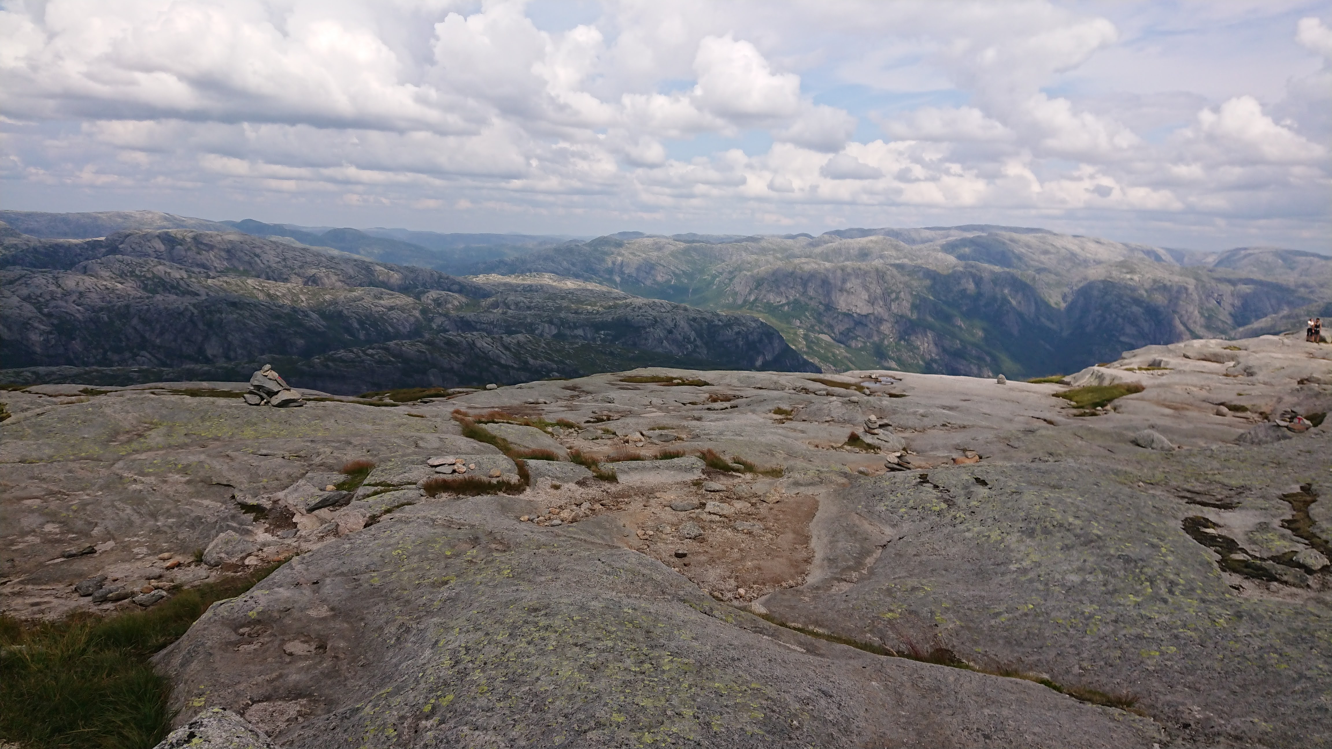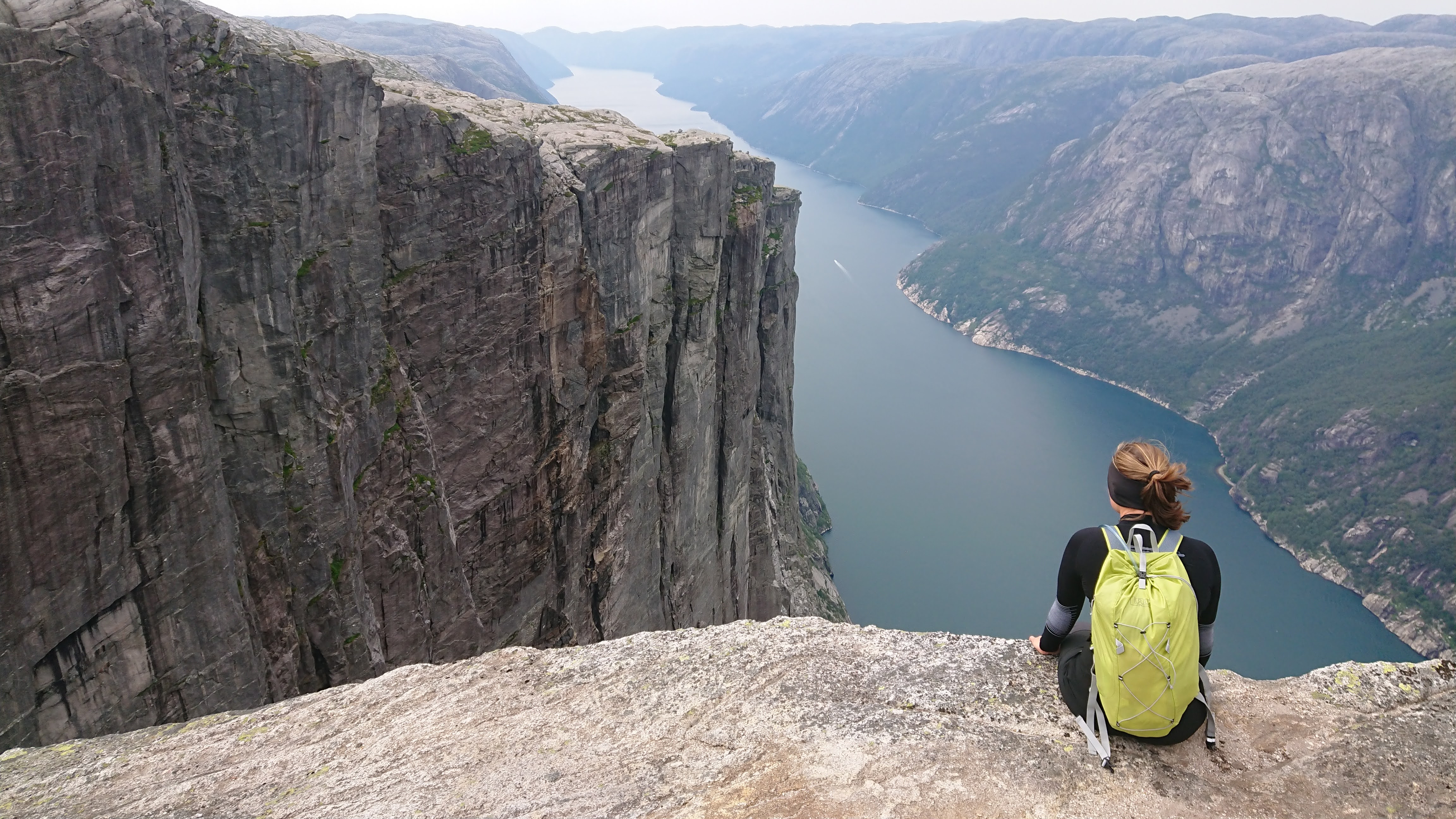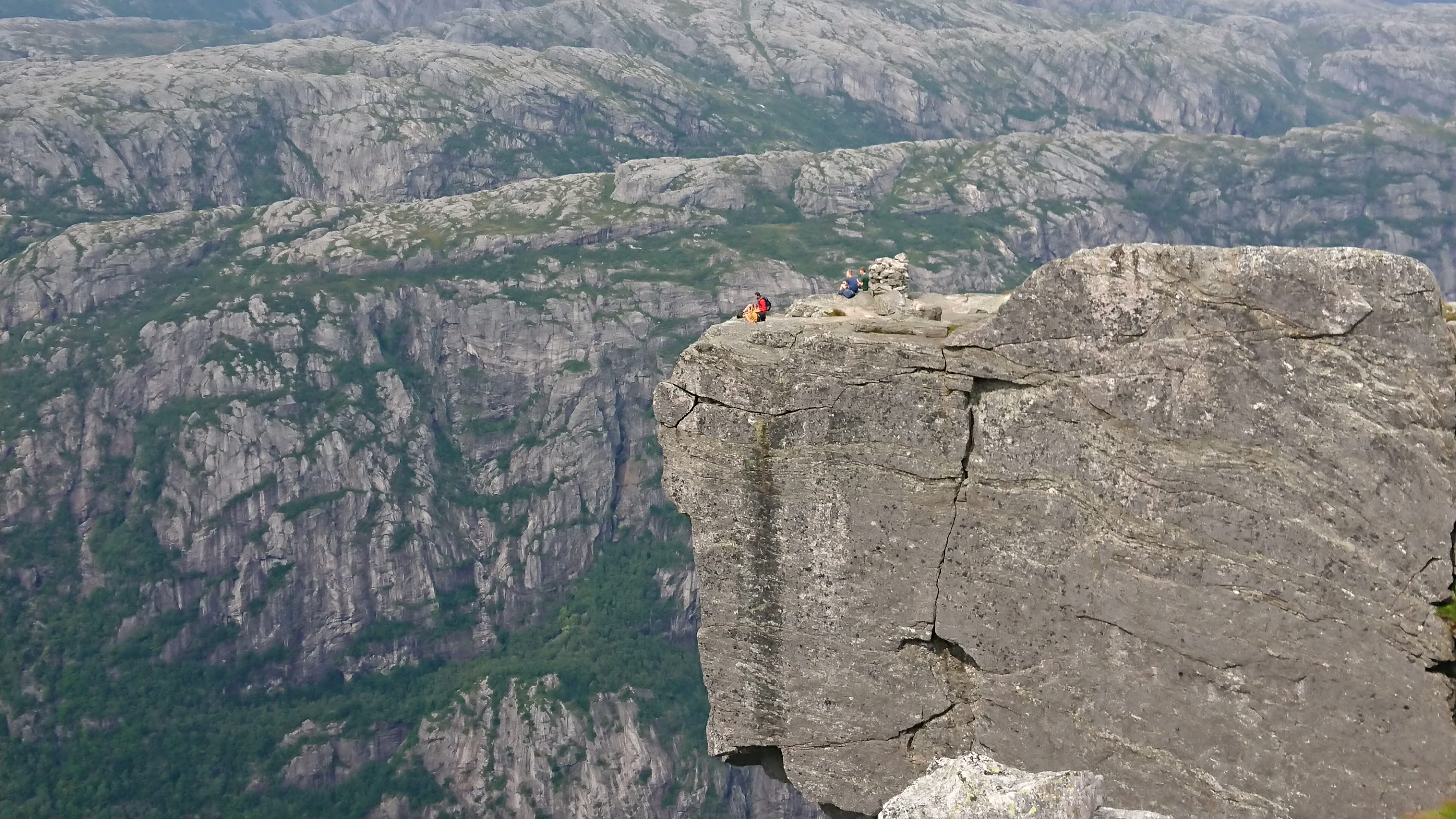 Der Kjeragbolten ist eine echt gut gelungene Laune der Natur. Eingeklemmt zwischen zwei Felswänden hängt der Riesenkiesel. Die Begehung empfehlen wir nur schwindelfreien und trittsicheren Leute, dahinter, bzw. darunter prangen 1000 m Abgrund. Dieser Abgrund ist das, was uns so sehr fasziniert. 1000 m vertikale Granitwände, die oben im 90° Winkel enden. Dazu eine unglaublich schöne Aussicht auf den Lysefjord. Wie Schwämme saugen wir die Eindrücke auf. Diese Landschaft bietet kein Platz für Alltagssorgen, hier wird das eigene Dasein unwichtig. Hier herrscht die Natur.