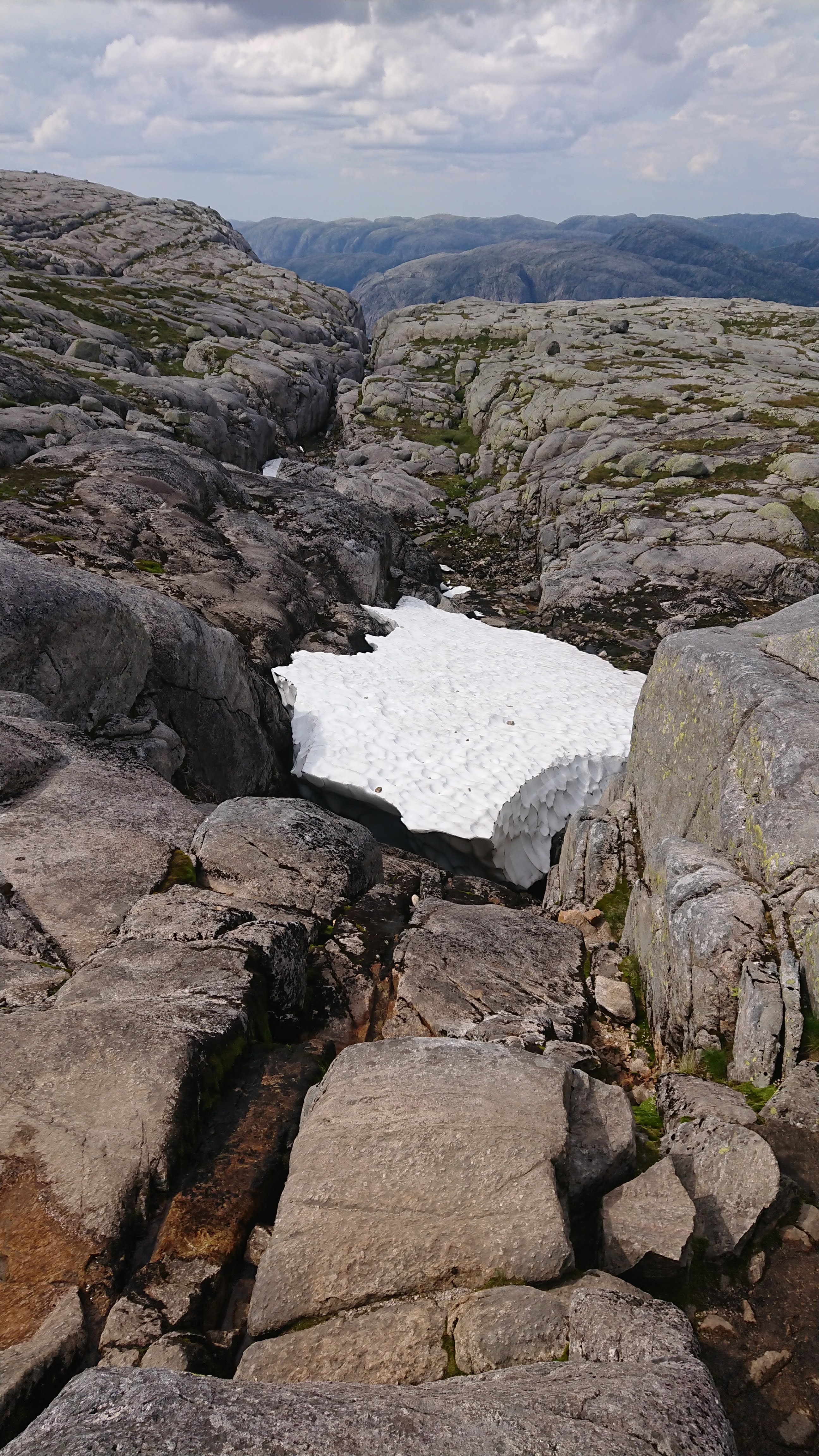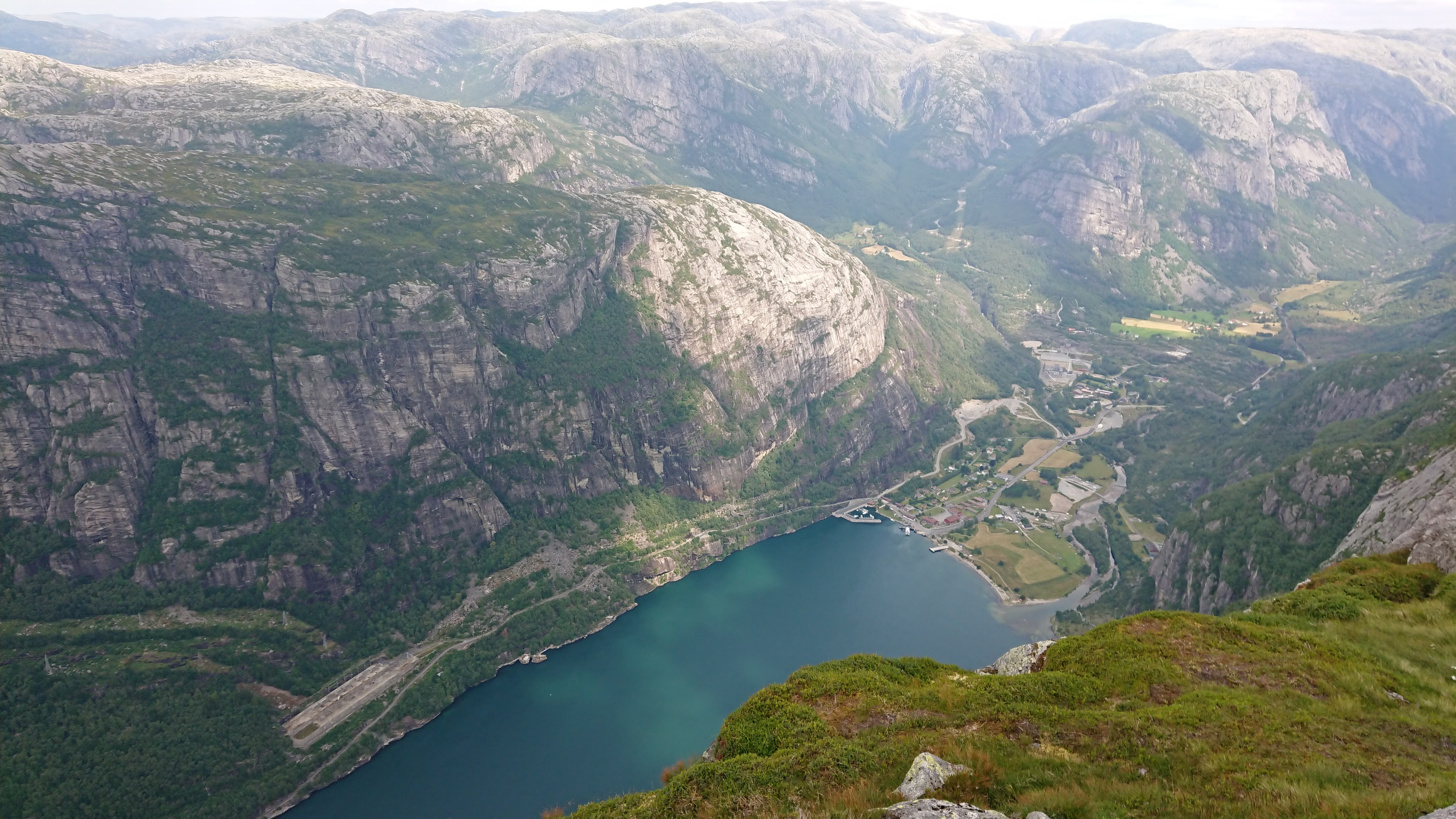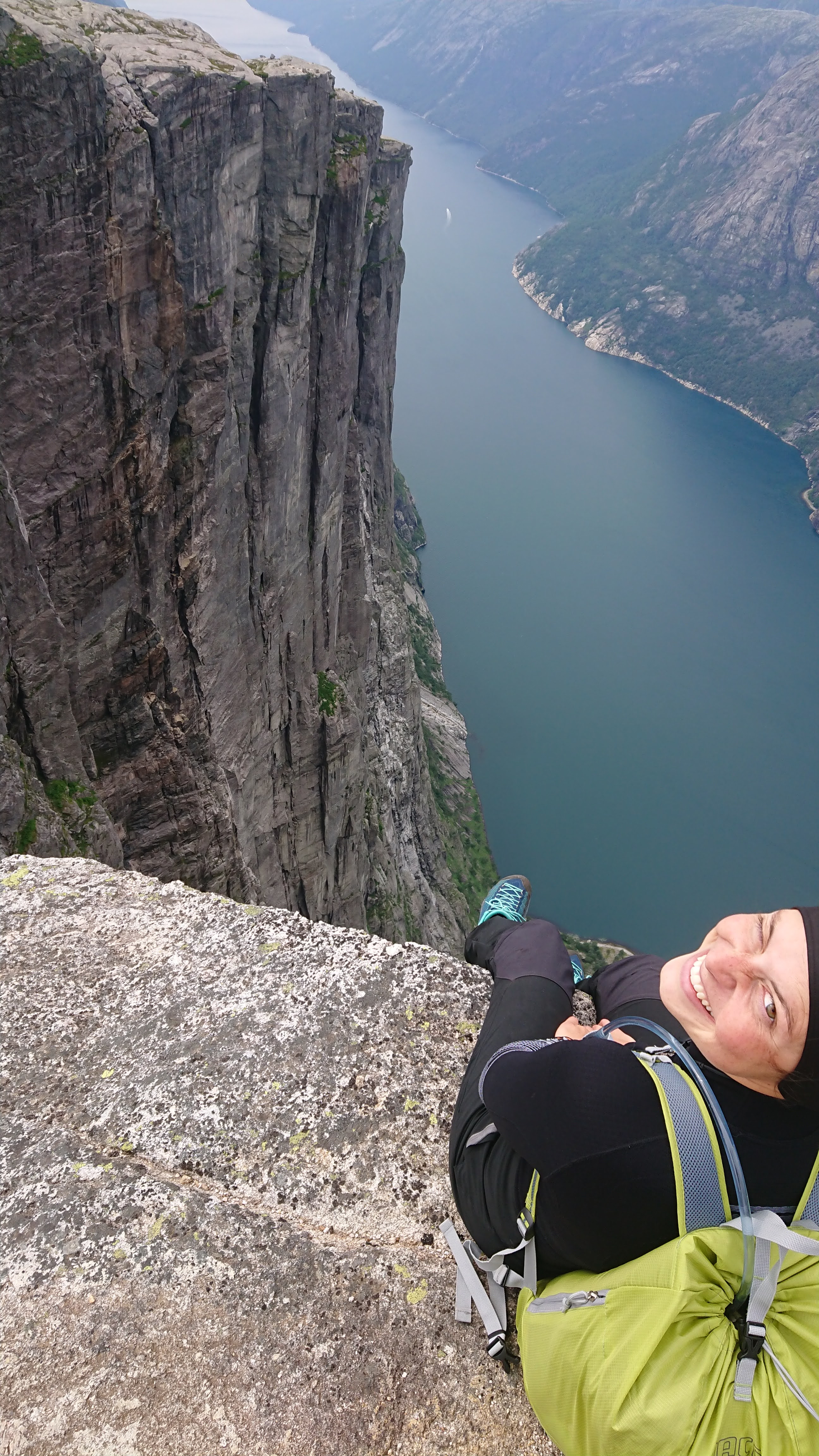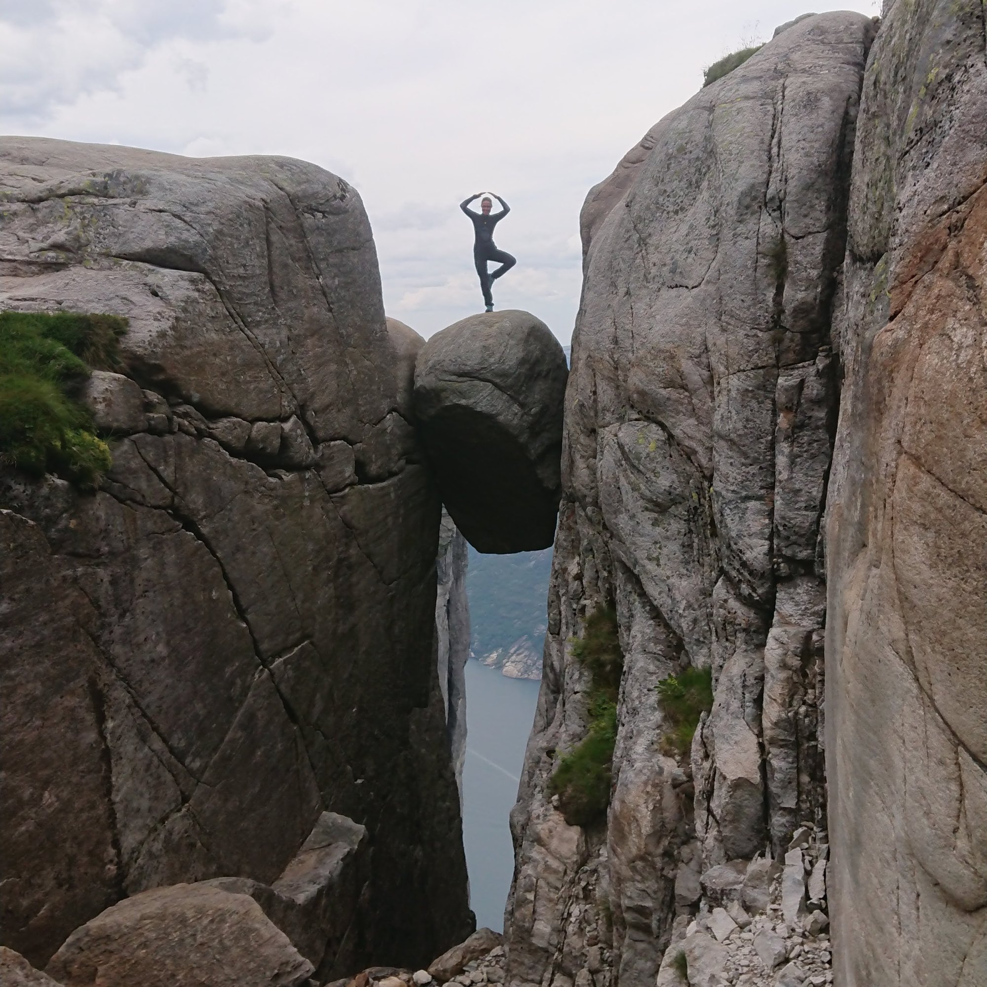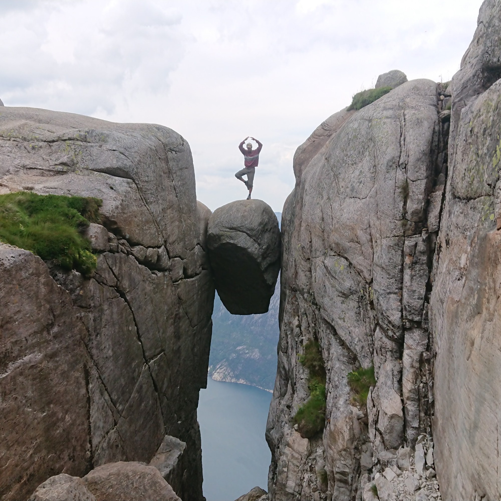 Der Kjeragbolten ist eine echt gut gelungene Laune der Natur. Eingeklemmt zwischen zwei Felswänden hängt der Riesenkiesel. Die Begehung empfehlen wir nur schwindelfreien und trittsicheren Leute, dahinter, bzw. darunter prangen 1000 m Abgrund. Dieser Abgrund ist das, was uns so sehr fasziniert. 1000 m vertikale Granitwände, die oben im 90° Winkel enden. Dazu eine unglaublich schöne Aussicht auf den Lysefjord. Wie Schwämme saugen wir die Eindrücke auf. Diese Landschaft bietet kein Platz für Alltagssorgen, hier wird das eigene Dasein unwichtig. Hier herrscht die Natur.