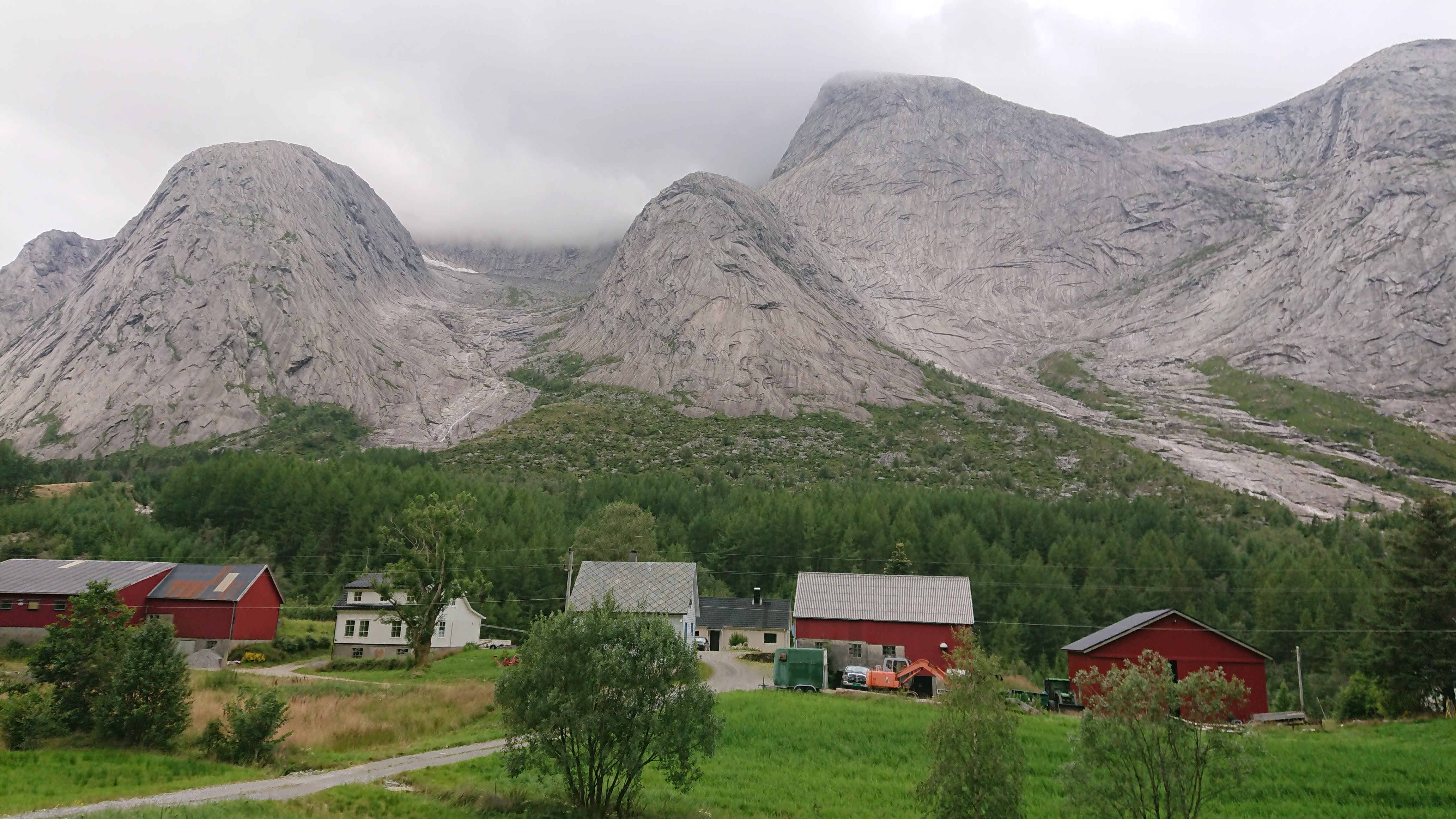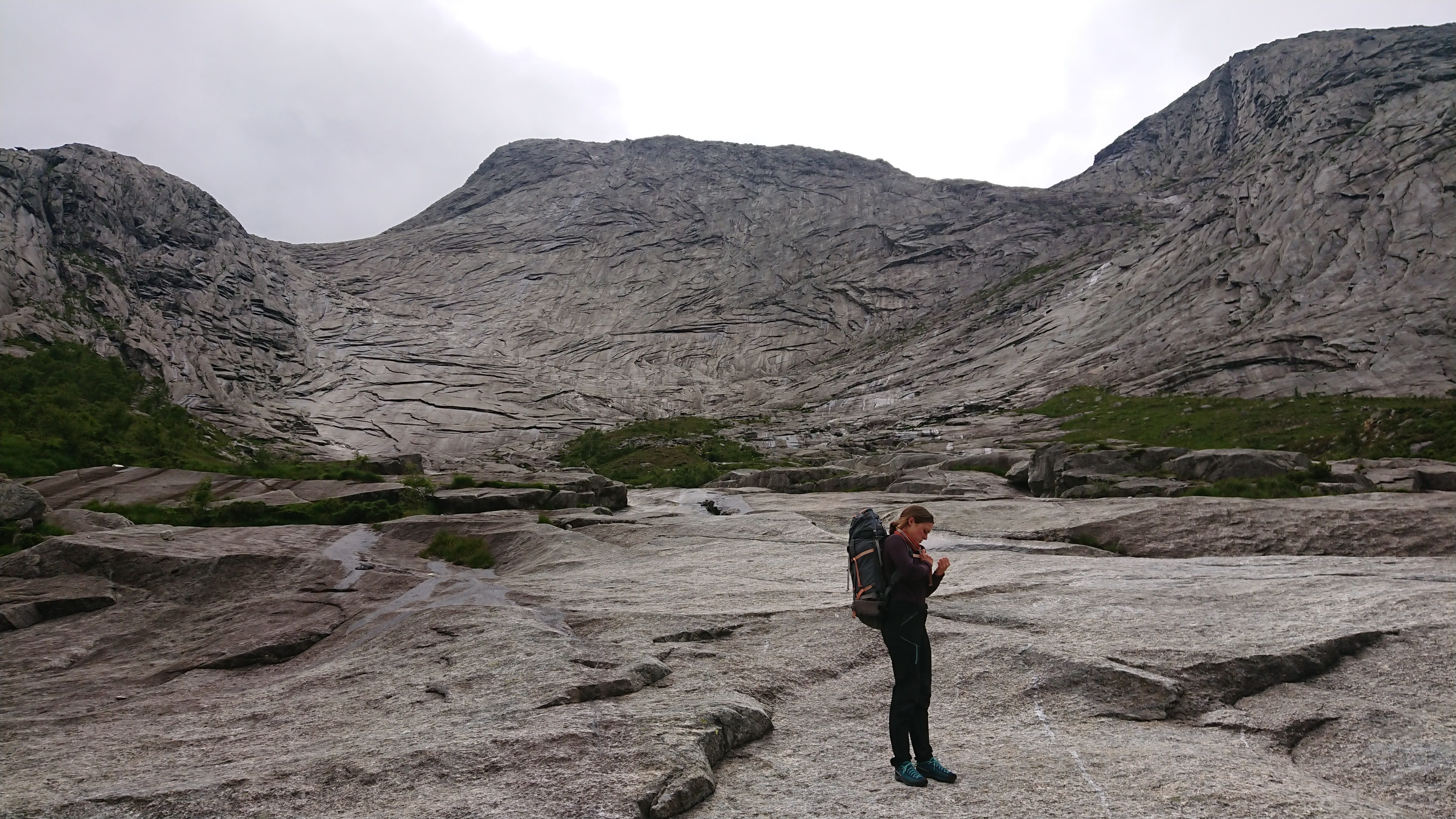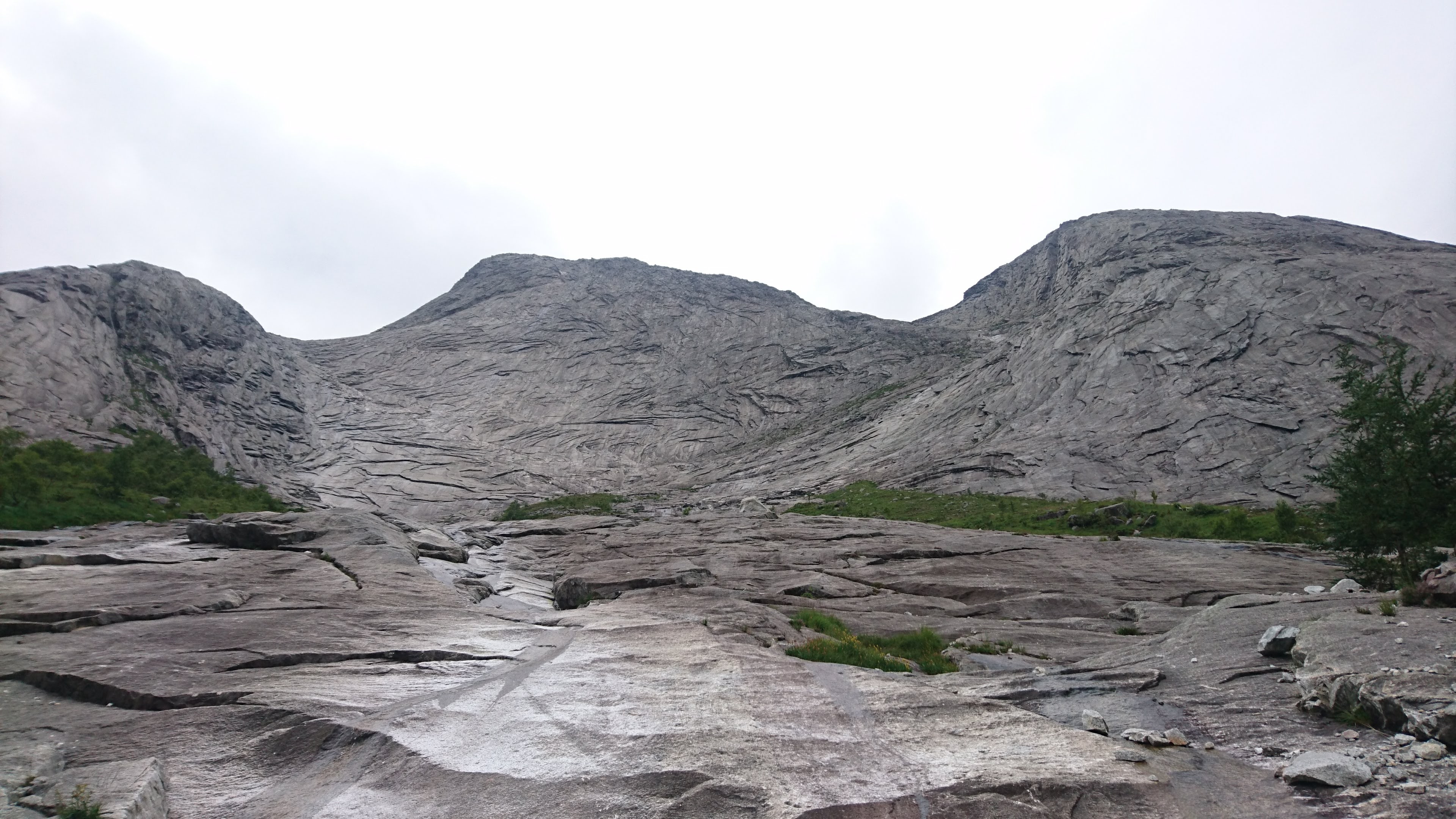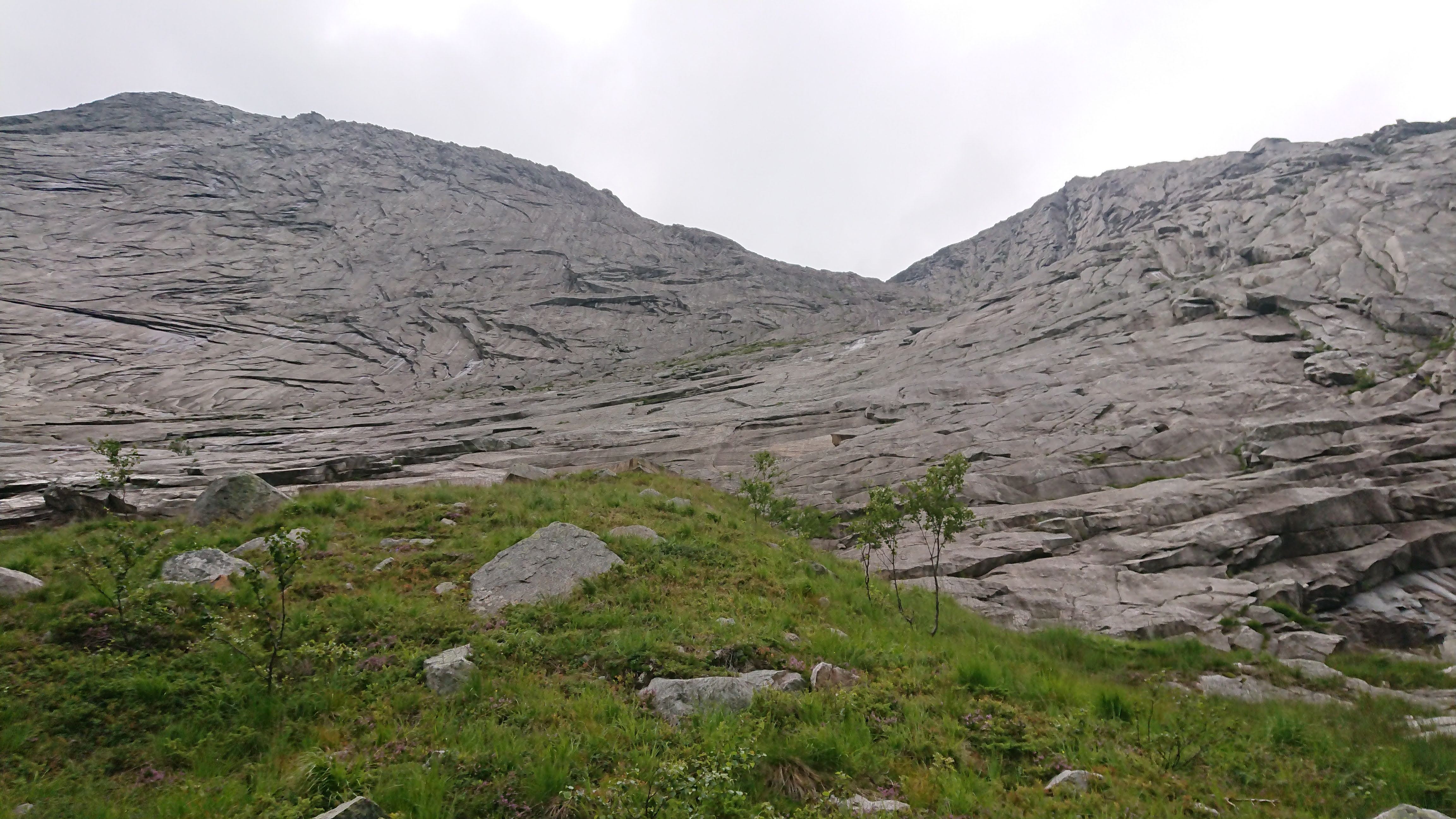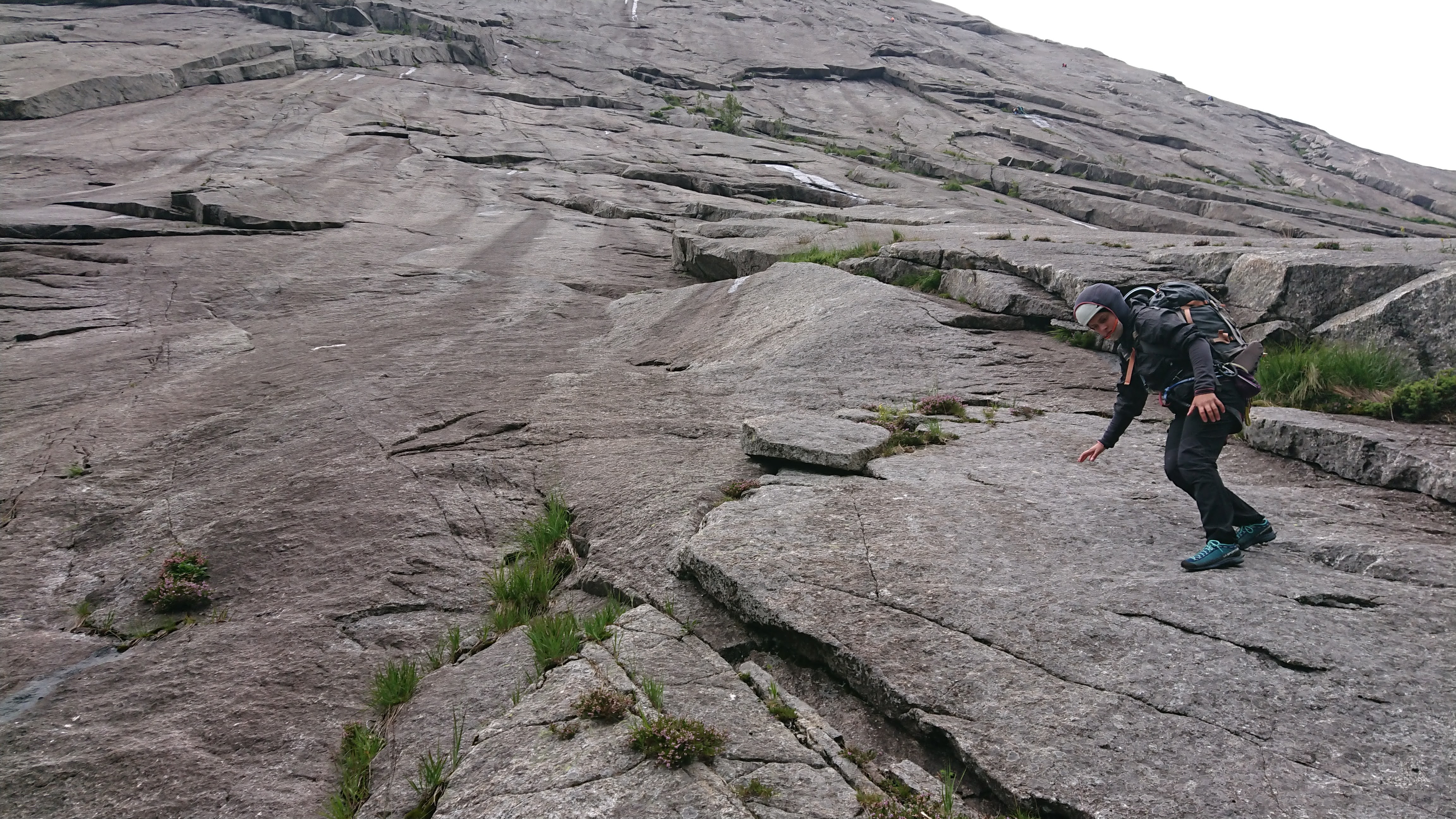 Uskedal wird als «das Yosemite von Norwegen» gehandelt. Schon von der Strasse schaut die grosse Felswand wunderschön aus. Zwar scheint es eher plattig, aber es gibt durchaus auch steilere Bereiche. Da die Orientierung in einem Trad-Gebiet ohne Topo quasi unmöglich ist und dieser Berg hier durchaus als alpin zu bewerten ist, entbrennt eine Diskussion über die Machbarkeit. Weg vom Meer, zwischen den Bergen hängen ausserdem die Wolken. Es handelt sich hier um meist sehr lange (12 Längen oder mehr) Routen, komplett Trad und ohne die Möglichkeit wieder abzuseilen, Basho ist sehr skeptisch und hält das Vorhaben für unverantwortlich. Ich habe jedoch gesehen, dass es auch 2-3 kürzere Routen gibt, die zwar nicht geboltet sind, aber man nach 3 Längen auf einem Band zu einer Abseilstelle queren kann. Als ich dann drei Jungs die in der Nähe zelten nach einem Topo frage, wird das Unterfangen schon weniger gefährlich und vielleicht sogar machbar.