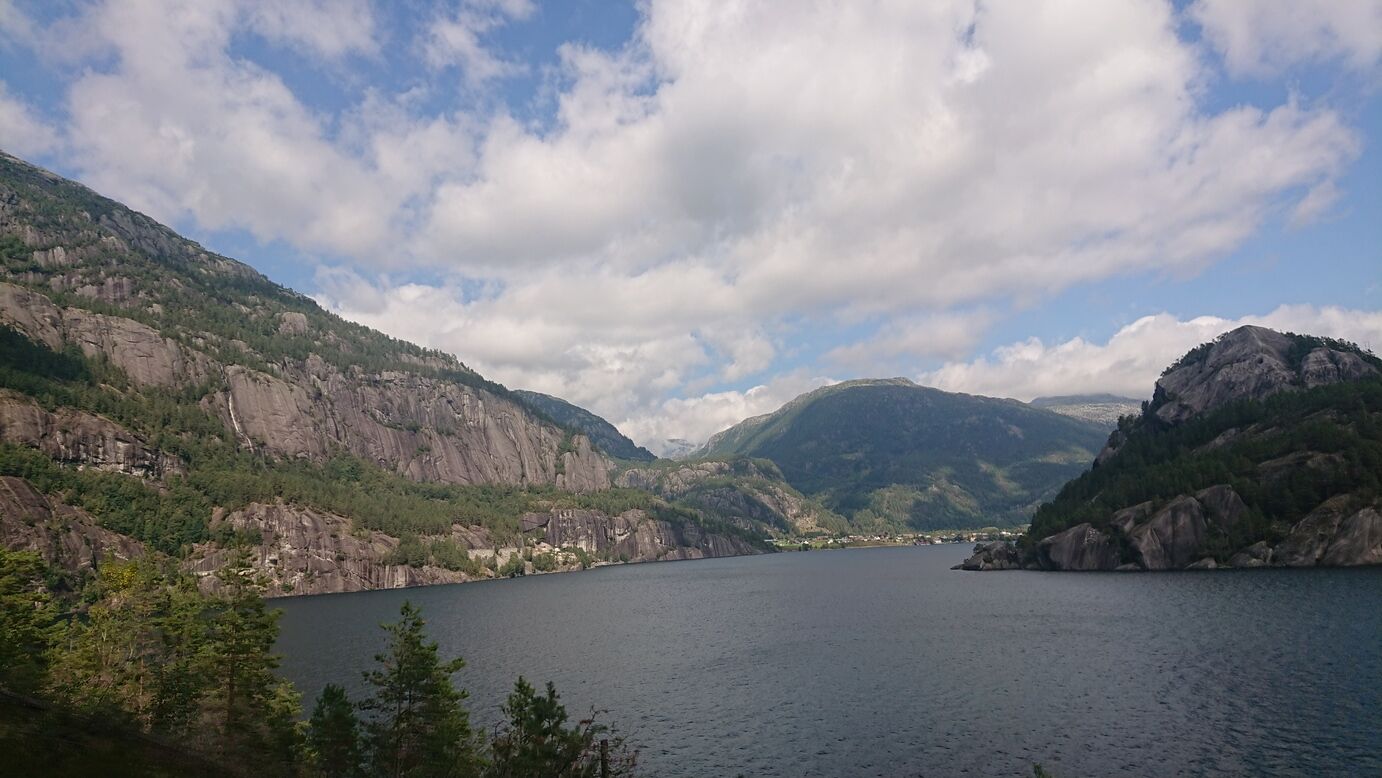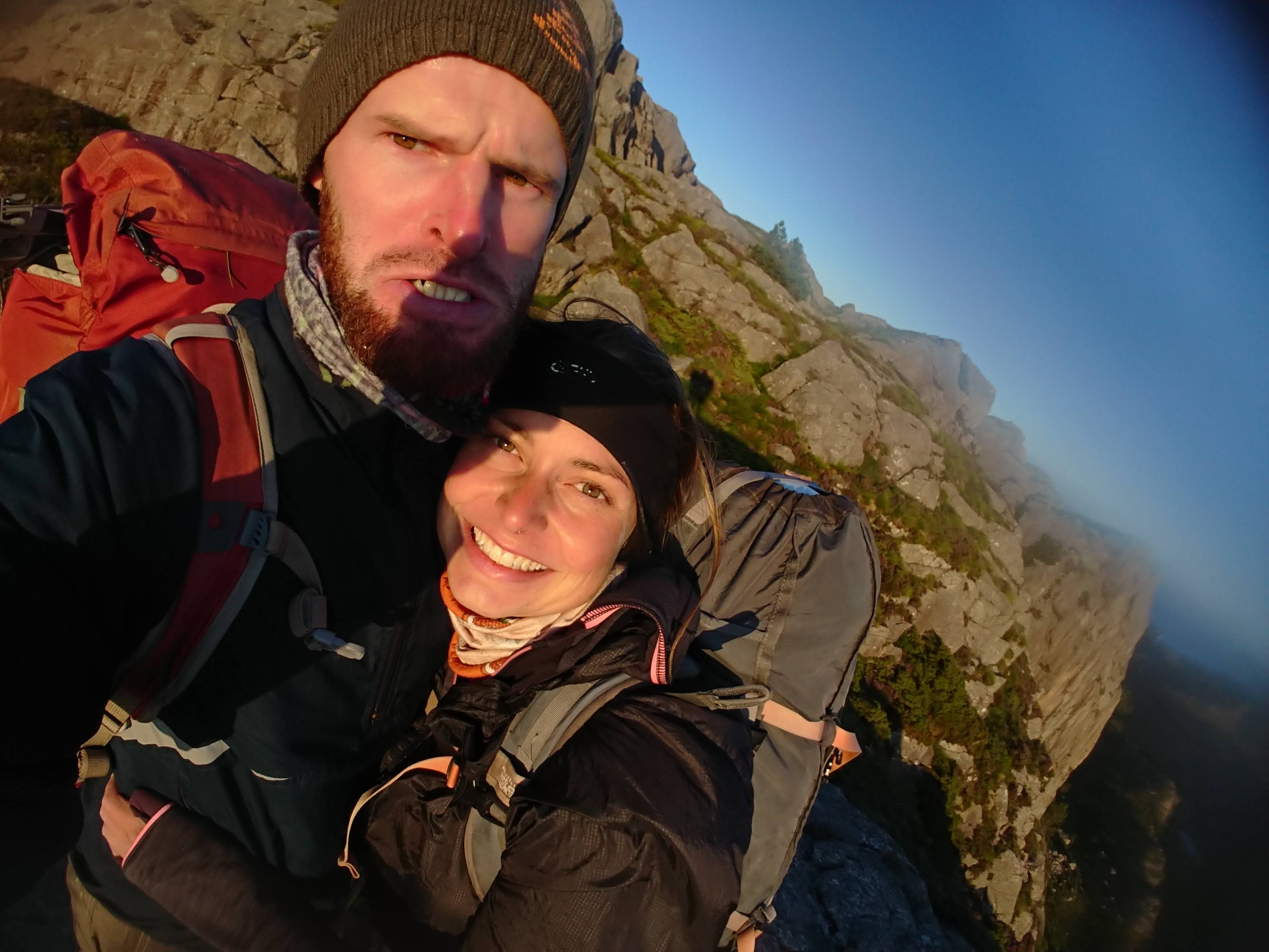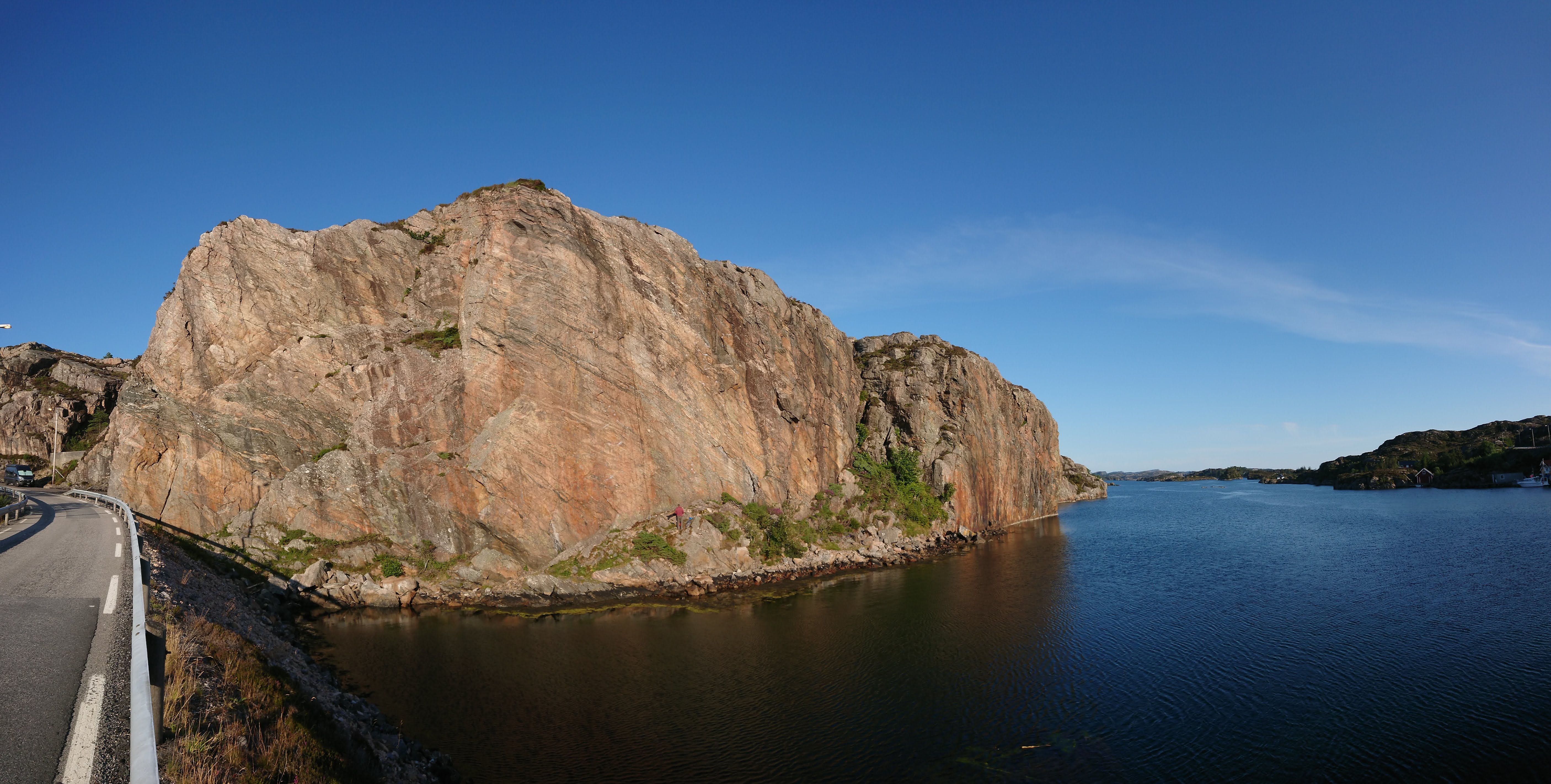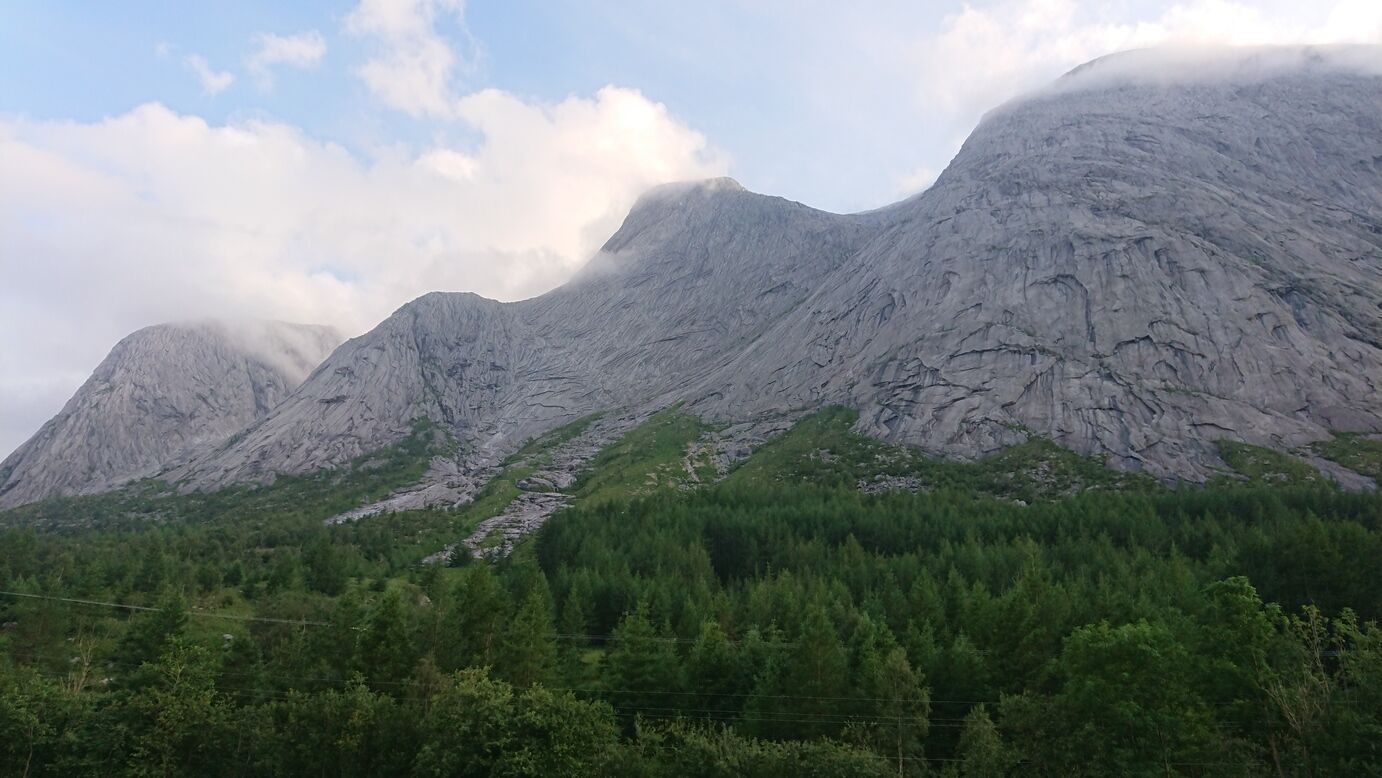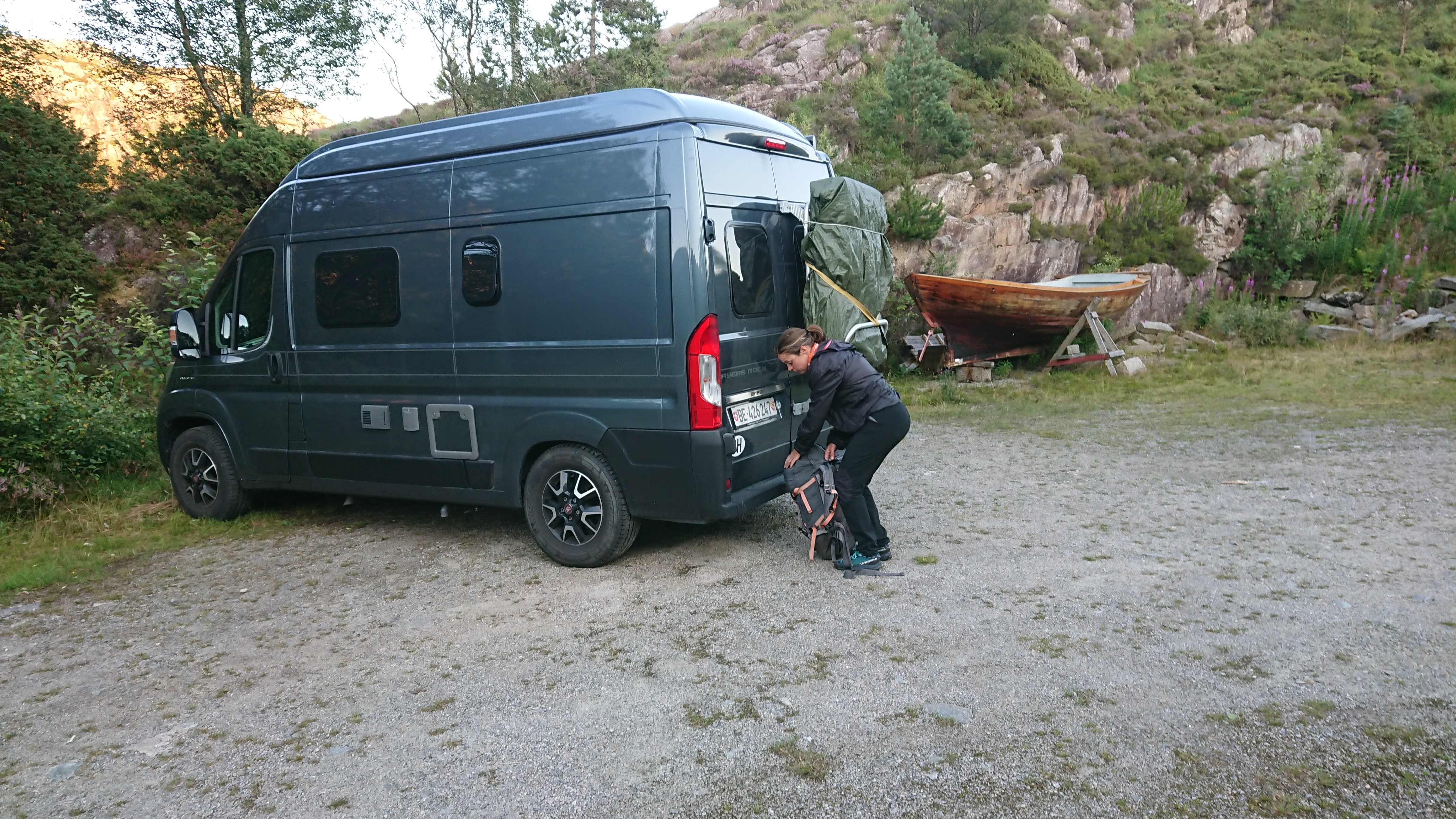 Uskedal wird als «das Yosemite von Norwegen» gehandelt. Schon von der Strasse schaut die grosse Felswand wunderschön aus. Zwar scheint es eher plattig, aber es gibt durchaus auch steilere Bereiche. Da die Orientierung in einem Trad-Gebiet ohne Topo quasi unmöglich ist und dieser Berg hier durchaus als alpin zu bewerten ist, entbrennt eine Diskussion über die Machbarkeit. Weg vom Meer, zwischen den Bergen hängen ausserdem die Wolken. Es handelt sich hier um meist sehr lange (12 Längen oder mehr) Routen, komplett Trad und ohne die Möglichkeit wieder abzuseilen, Basho ist sehr skeptisch und hält das Vorhaben für unverantwortlich. Ich habe jedoch gesehen, dass es auch 2-3 kürzere Routen gibt, die zwar nicht geboltet sind, aber man nach 3 Längen auf einem Band zu einer Abseilstelle queren kann. Als ich dann drei Jungs die in der Nähe zelten nach einem Topo frage, wird das Unterfangen schon weniger gefährlich und vielleicht sogar machbar.