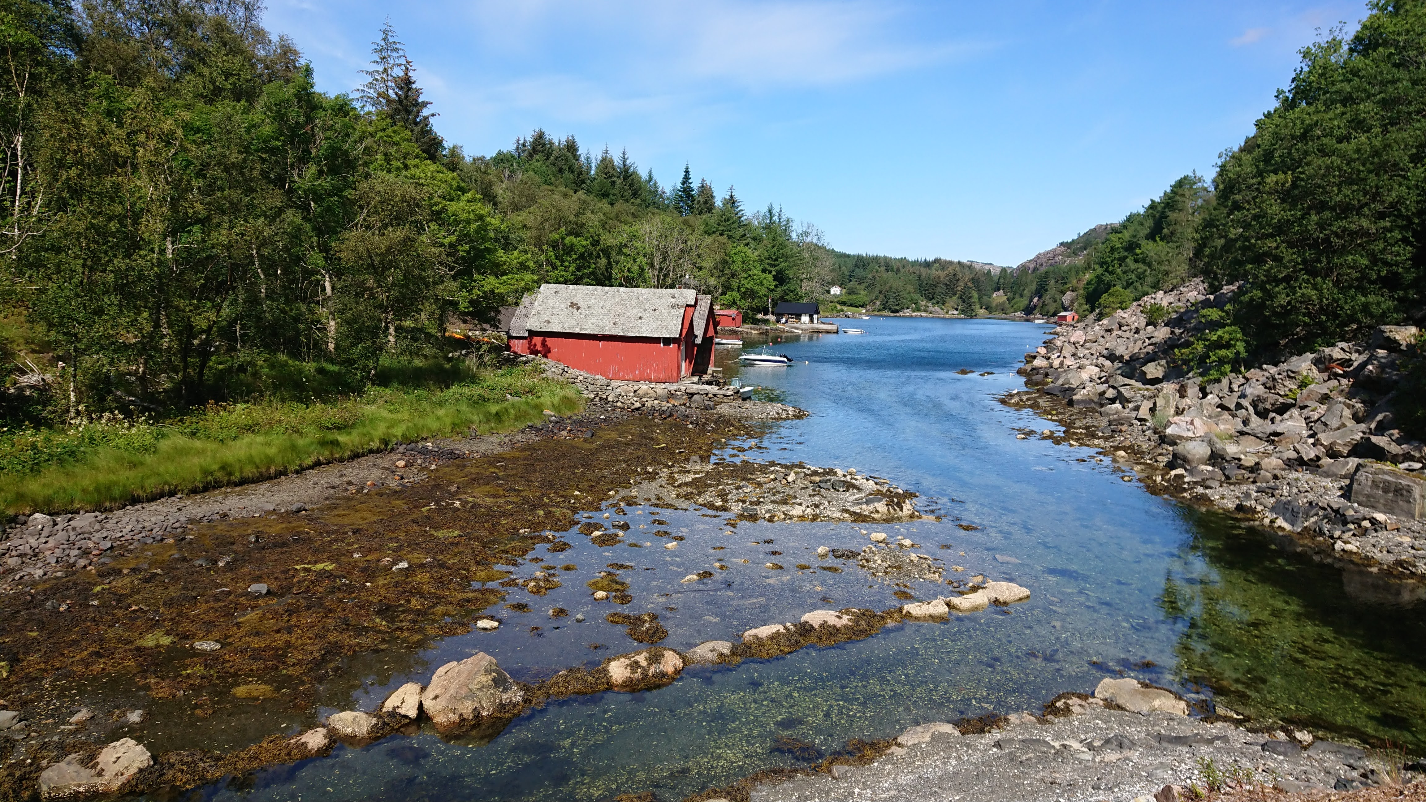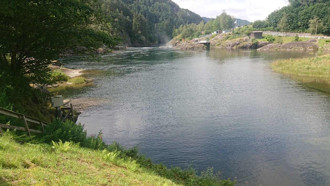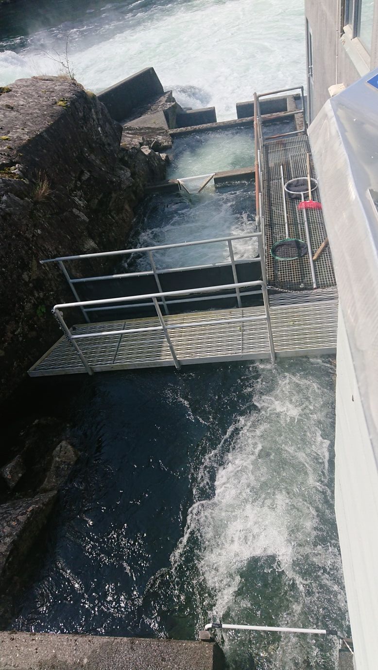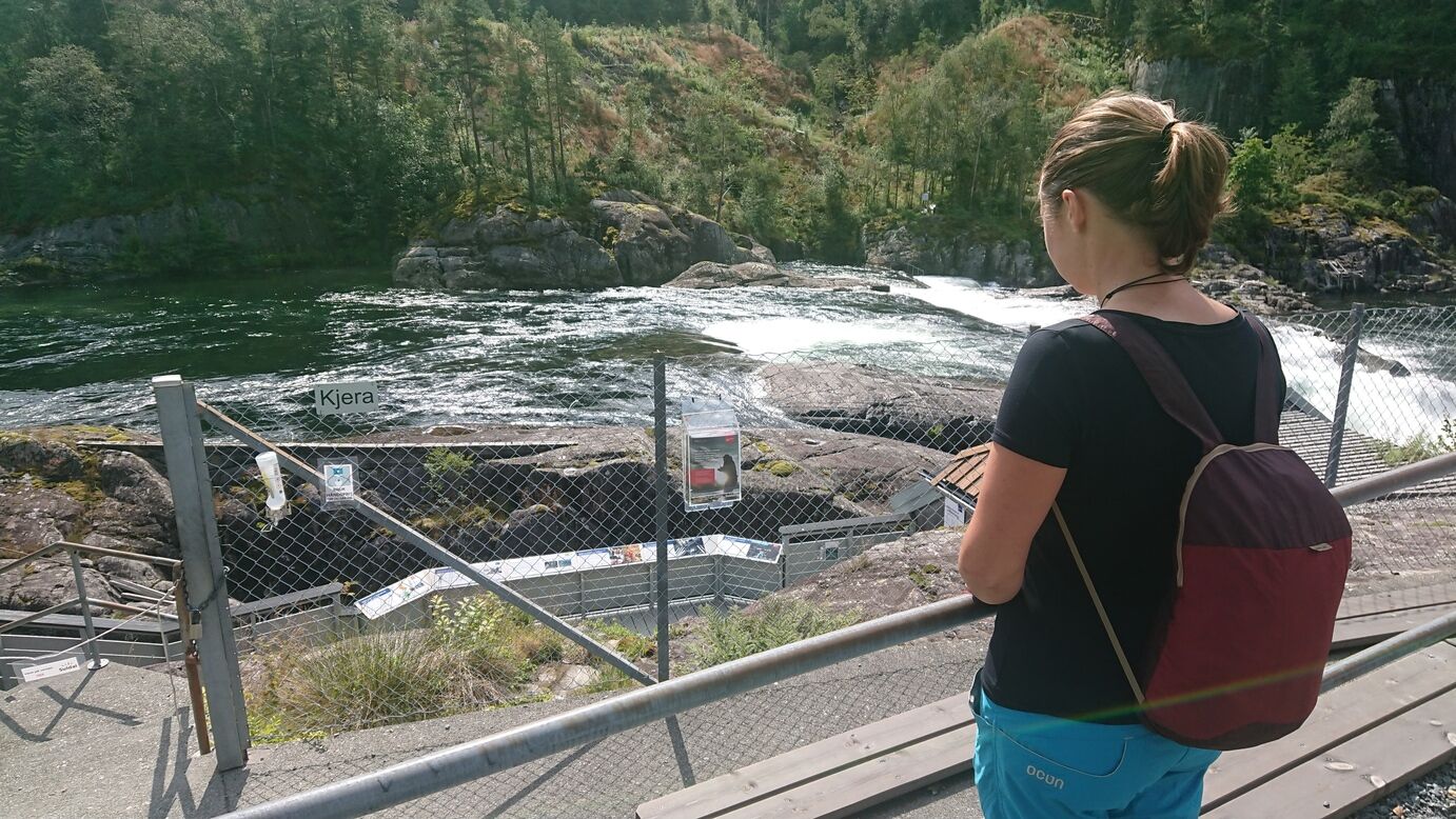 Fertig Arbeit, fertig Regen. Leider steht erst mal wieder eine längere Fahrzeit an. Auf dem Weg Richtung Uskedal besuchen wir in Sand eines der wichtigsten Sehenswürdigkeiten der Region – das erstgebaute Laksestudio Norwegens. Wegen einem Wasserkraftwerk wurde 1960 eine Fischtreppe gebaut. Durch eine Glasscheibe kann aus einem kleinen Häuschen eine der Treppenstufen beobachtet werden. Für je 40 Kronen kriegen wir eine Privatführung. Die Lachse sind zu diesem Zeitpunkt leider woanders (bis auf zwei oder drei, die nur Basho gesehen hat), dafür bekommen wir durch das Gespräch mit der Studentin einen kleinen Eindruck vom Leben auf dem Land. Ob sie nach dem Studium in Bergen hierher zurückkehre, hänge davon ab ob ihre 5 Freunde hier (alle Gleichaltrigen des Dorfes) auch zurückkehren.
