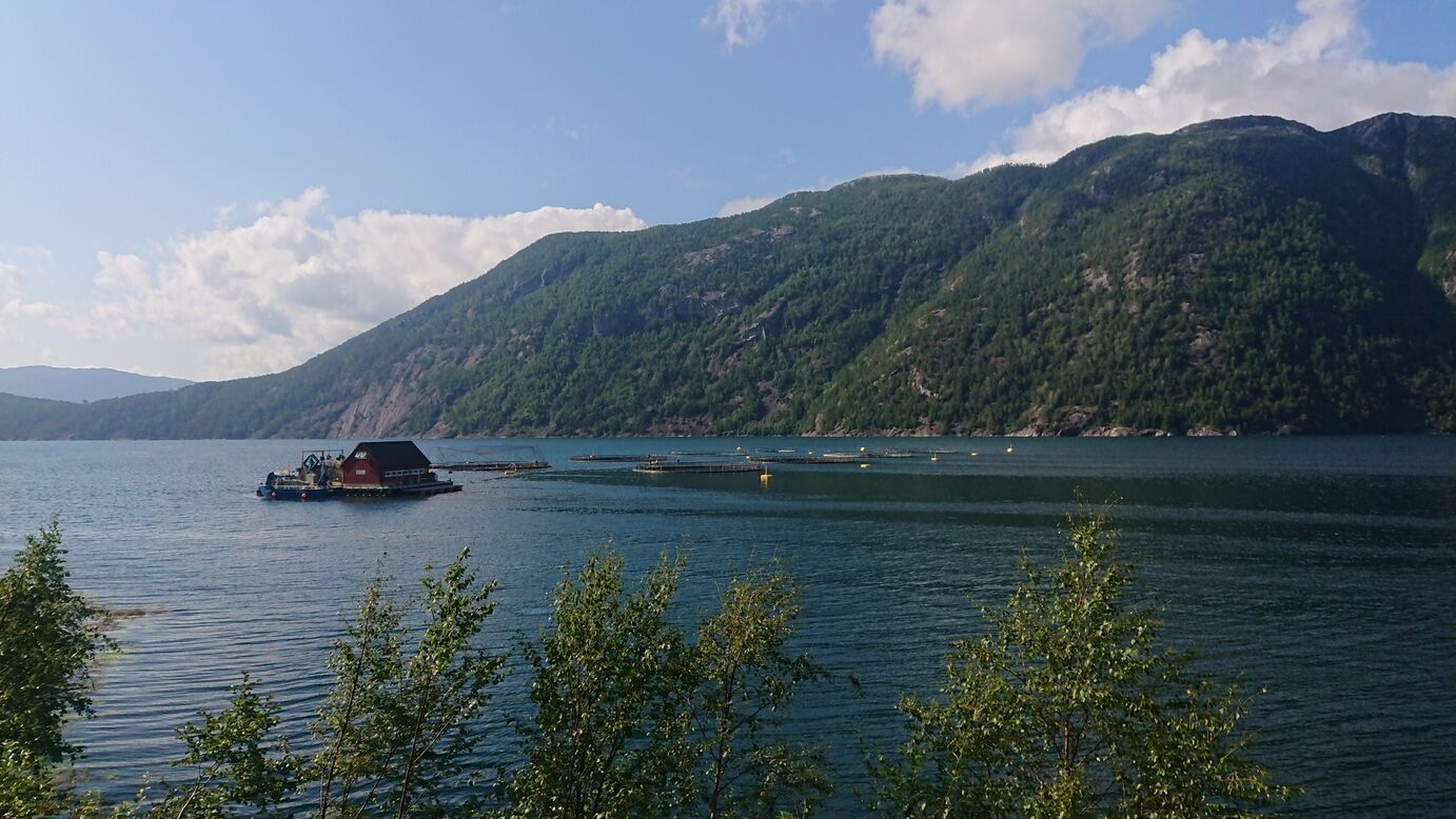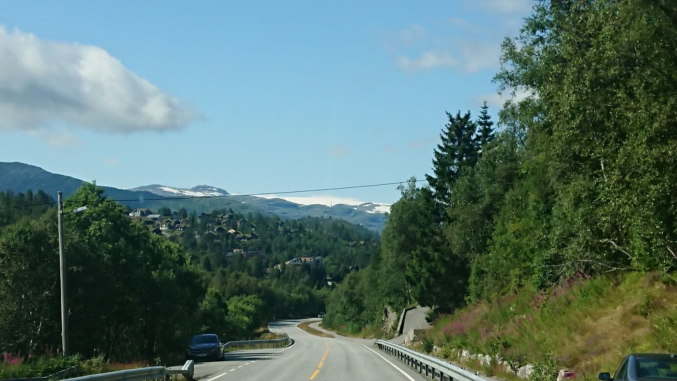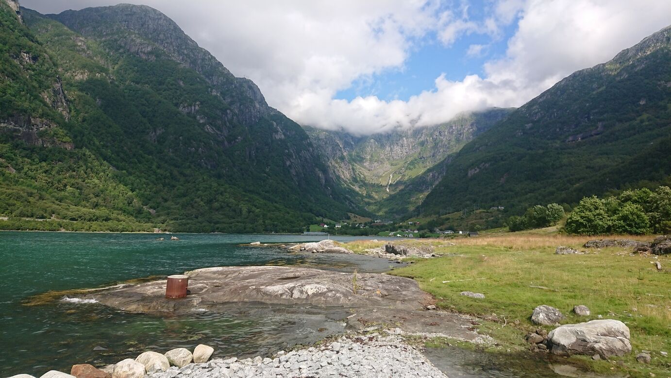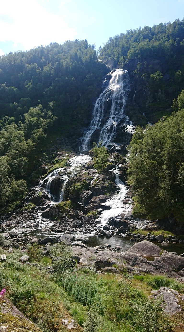 Fertig Arbeit, fertig Regen. Leider steht erst mal wieder eine längere Fahrzeit an. Auf dem Weg Richtung Uskedal besuchen wir in Sand eines der wichtigsten Sehenswürdigkeiten der Region – das erstgebaute Laksestudio Norwegens. Wegen einem Wasserkraftwerk wurde 1960 eine Fischtreppe gebaut. Durch eine Glasscheibe kann aus einem kleinen Häuschen eine der Treppenstufen beobachtet werden. Für je 40 Kronen kriegen wir eine Privatführung. Die Lachse sind zu diesem Zeitpunkt leider woanders (bis auf zwei oder drei, die nur Basho gesehen hat), dafür bekommen wir durch das Gespräch mit der Studentin einen kleinen Eindruck vom Leben auf dem Land. Ob sie nach dem Studium in Bergen hierher zurückkehre, hänge davon ab ob ihre 5 Freunde hier (alle Gleichaltrigen des Dorfes) auch zurückkehren.