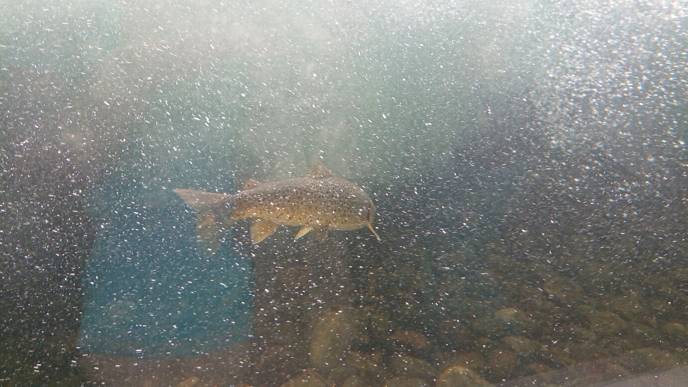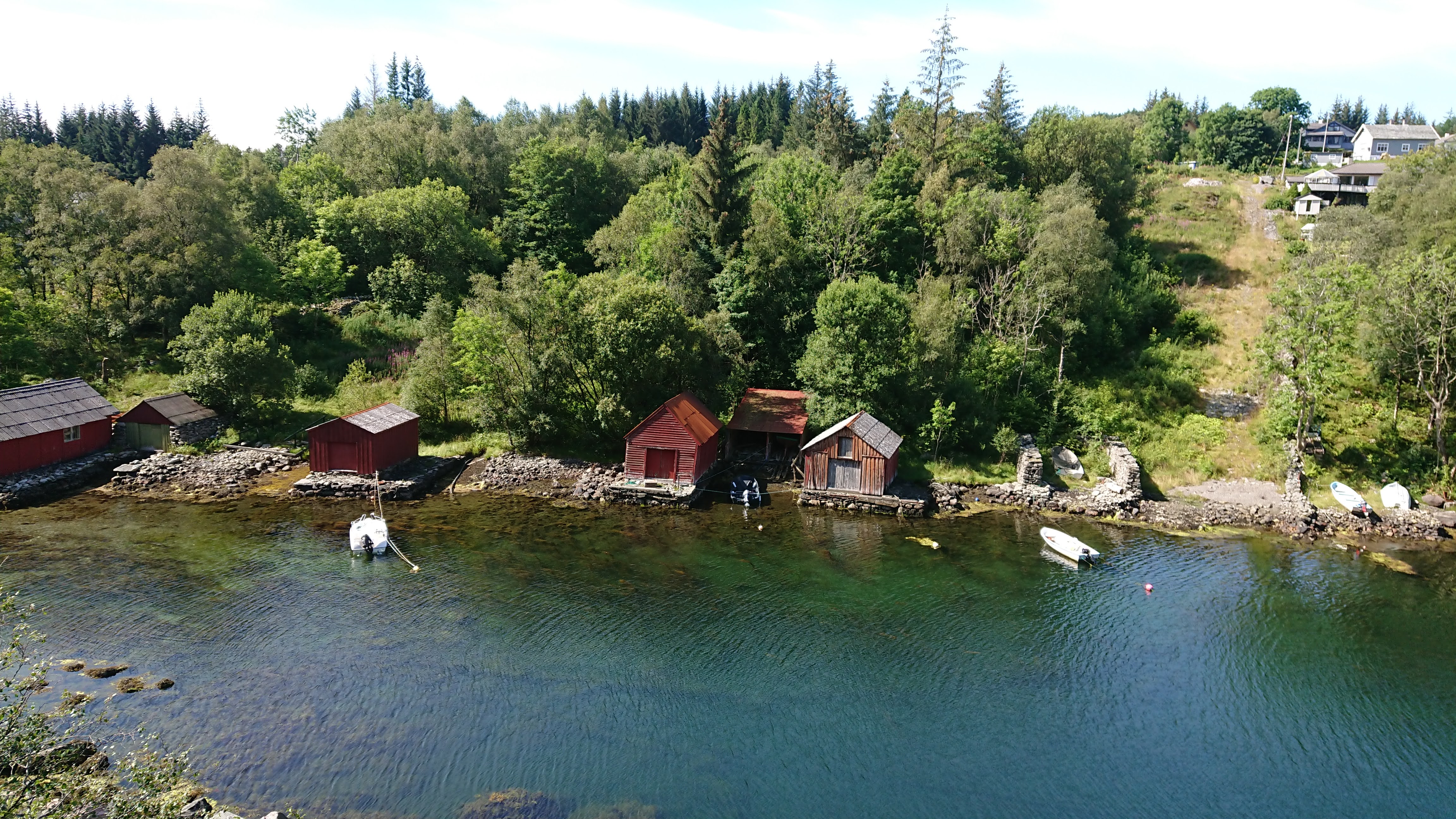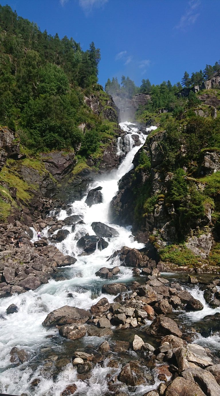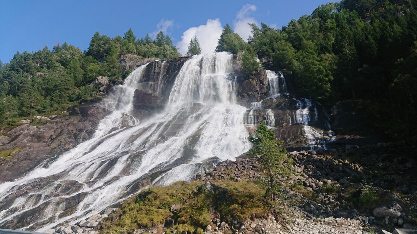 Fertig Arbeit, fertig Regen. Leider steht erst mal wieder eine längere Fahrzeit an. Auf dem Weg Richtung Uskedal besuchen wir in Sand eines der wichtigsten Sehenswürdigkeiten der Region – das erstgebaute Laksestudio Norwegens. Wegen einem Wasserkraftwerk wurde 1960 eine Fischtreppe gebaut. Durch eine Glasscheibe kann aus einem kleinen Häuschen eine der Treppenstufen beobachtet werden. Für je 40 Kronen kriegen wir eine Privatführung. Die Lachse sind zu diesem Zeitpunkt leider woanders (bis auf zwei oder drei, die nur Basho gesehen hat), dafür bekommen wir durch das Gespräch mit der Studentin einen kleinen Eindruck vom Leben auf dem Land. Ob sie nach dem Studium in Bergen hierher zurückkehre, hänge davon ab ob ihre 5 Freunde hier (alle Gleichaltrigen des Dorfes) auch zurückkehren.