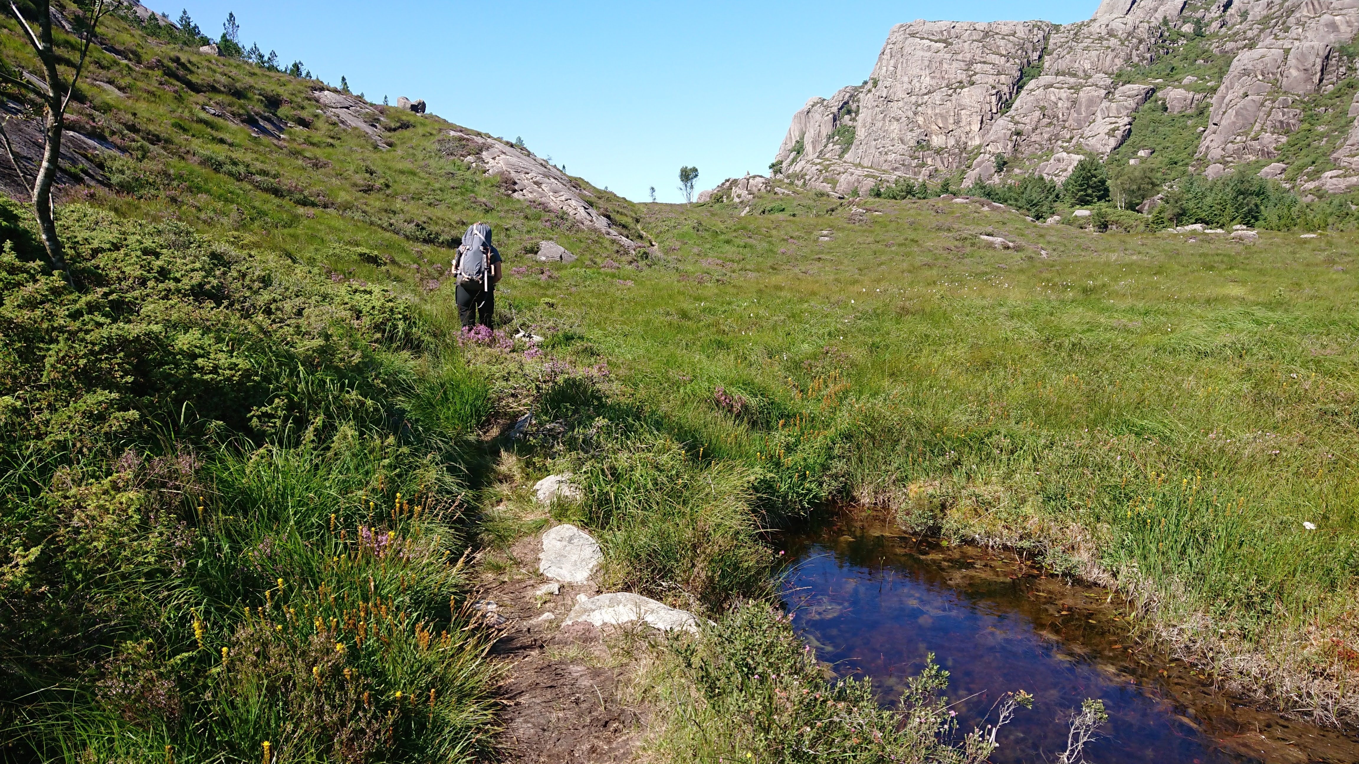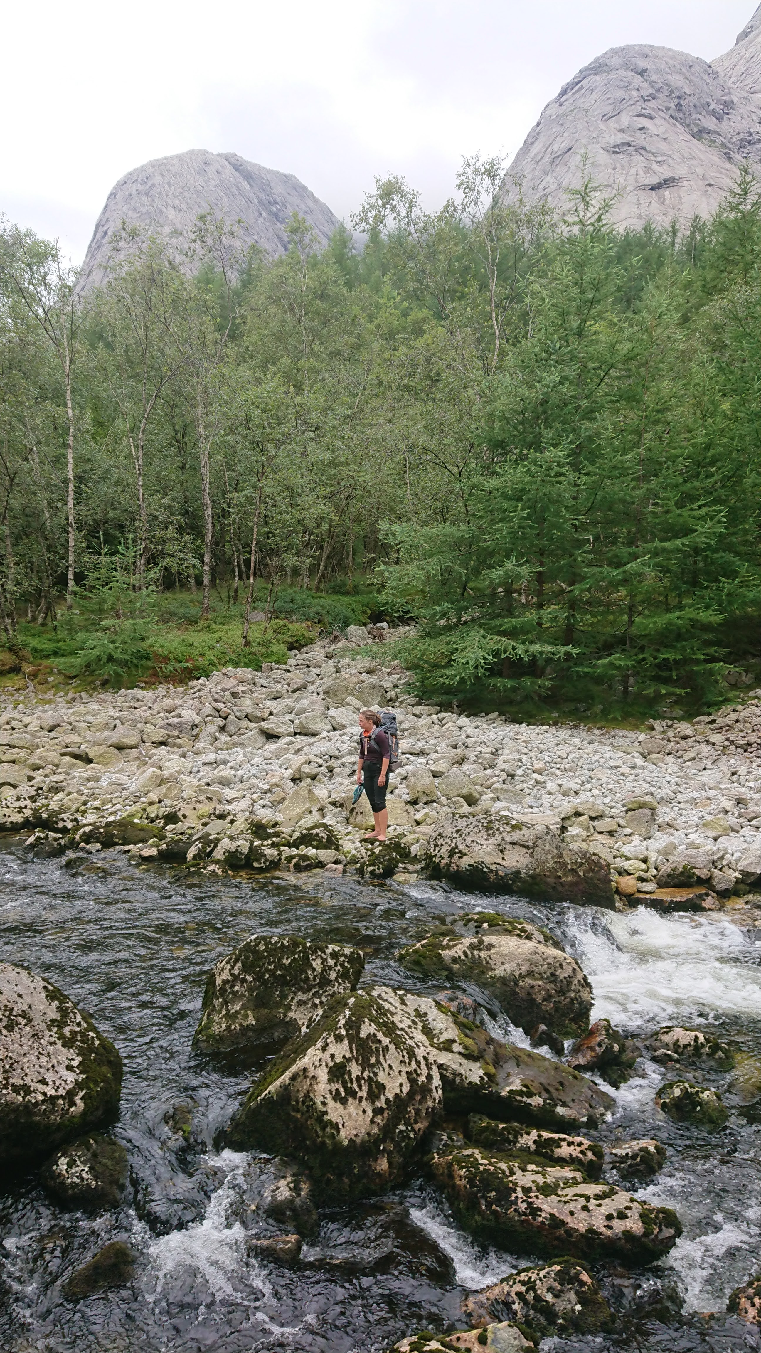 Am nächsten Morgen: Wir packen die Rucksäcke und ziehen los. Der Zustieg bringt wieder einmal nasse Füsse, diesmal nicht wegen einem Moor (obwohl wir auch hier von Stein zu Stein gehen um nicht in nasses Moos zu stehen) sondern weil wir einen Bach durchqueren müssen.