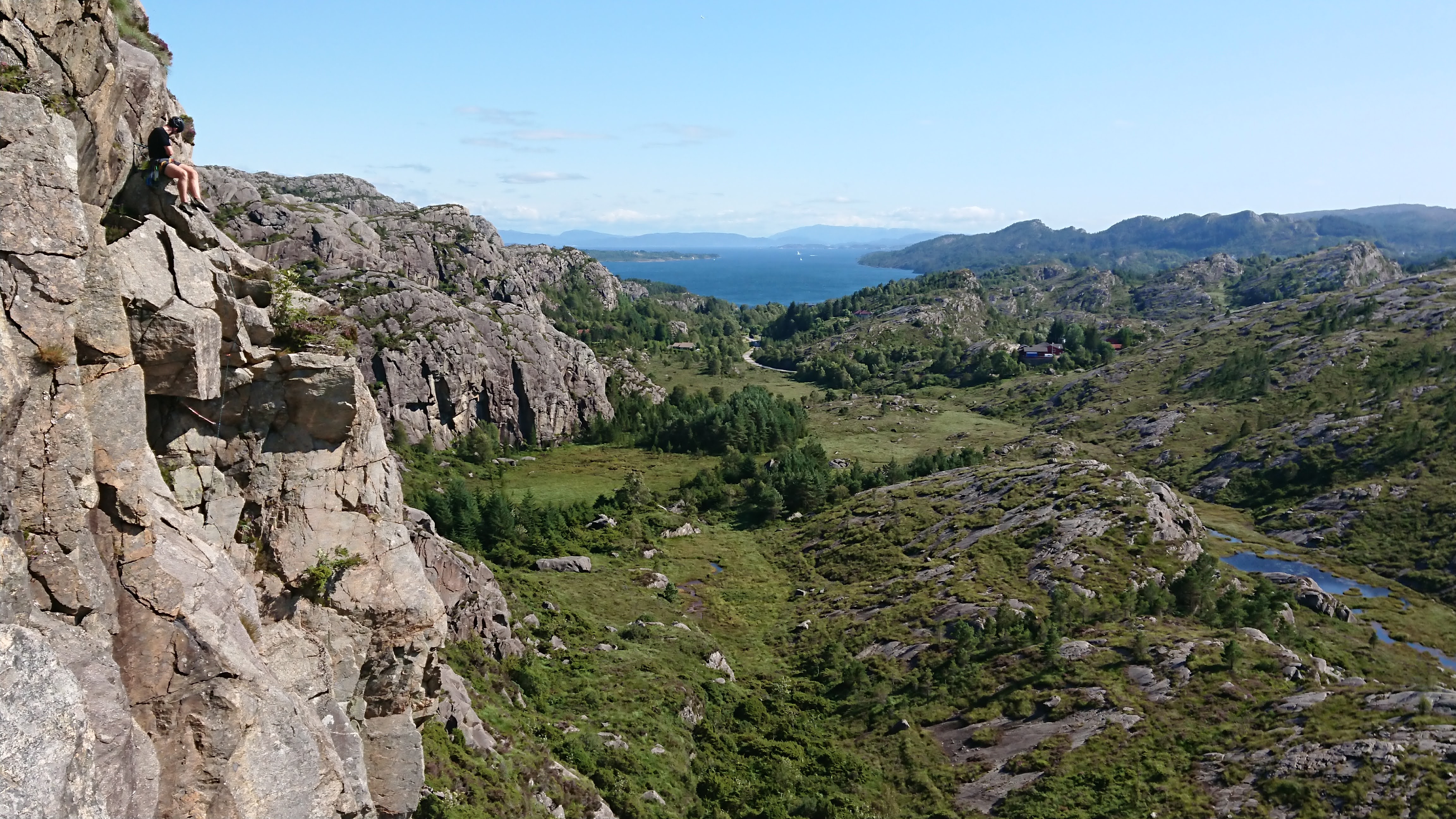 Nach dem mässigem Klettererlebnis in Uskedal suchen wir uns wieder etwas kleinere Wände. Über Landstrassen und einen Abschnitt mir der Fähre gelangen wir nach Bergen. Die Stadt selbst interessiert uns wenig, dafür sind die Möglichkeiten zum Klettern hier schon beachtlich. Wir entscheiden uns für das Gebiet «Tellnes, Trollveggen», grösstenteils naturbelassen (abgesehen von einzelnen eingerichteten Abseilstellen), 3-4 Seillängen, unglaublich schöne Landschaft mitten im Moorgebiet. Von einem Einheimischen bekommen wir gute Tipps für schöne Linien und geniessen 2 Tage lang echt gute Trad-Kletterei!