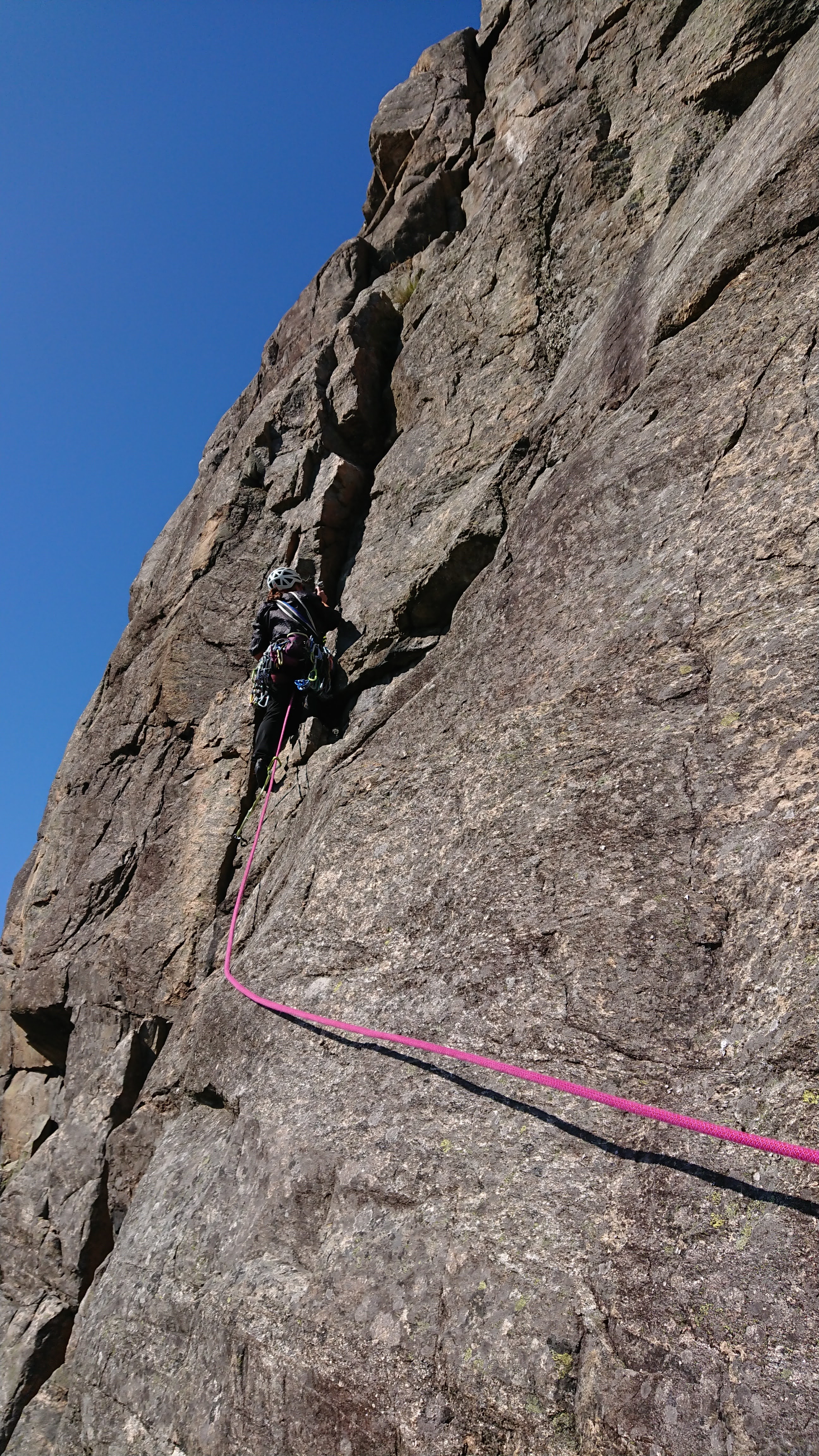 Es hat unerwartet viele Seilschaften in der Wand, die Bewölkung scheint niemanden zu beunruhigen. In der auserwählten Route ist schon eine 3er-Seilschaft drin, gerade erst gestartet. So suchen wir nach einer Alternative – es gibt da noch zwei weitere Kandidaten… nur wo sind die den? Auch mit Topo stellt sich die Suche nach den Einstiegen als nicht ganz so trivial heraus. Als wir dann davor stehen, bemerken wir, dass der Riss nass und glitschig ist. Nach weiterem Gesuche finden wir dann eine akzeptable Linie und Basho steigt in die erste Länge ein…